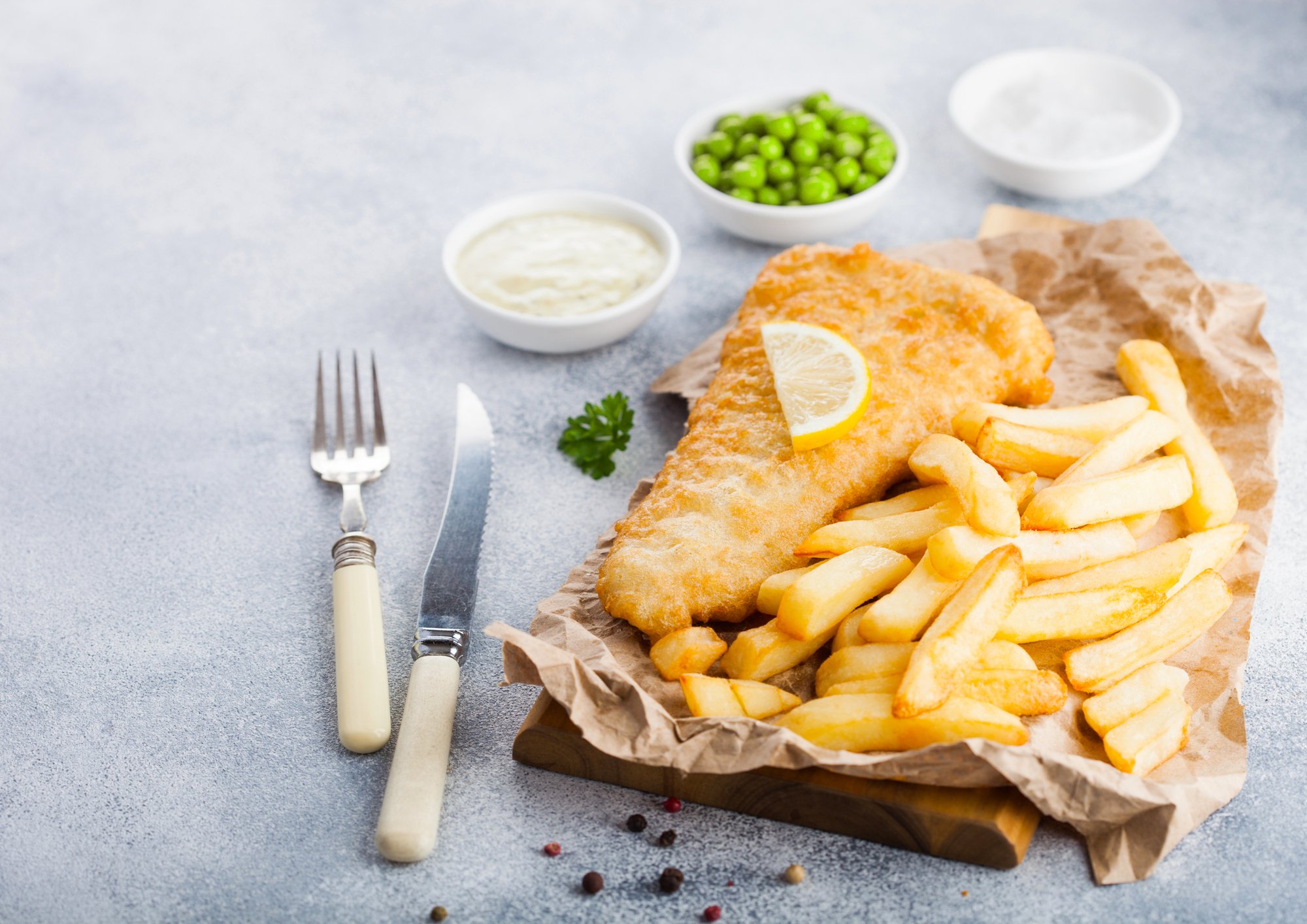 Знаменита страва Fish and Chips — риба й чипси, у цьому випадку картопля смажена у фритюрі, привітно зустрінуть вас в кожному пабі й ресторані Великої Британії. Філе білої риби, обсмажене в клярі й картопля, завжди подаються разом, а іноді у супроводі пюре з бобових або салату зі свіжих овочів. Якщо ви завітаєте до Британії, краще за все скуштувати цю страву у справжньому старовинному пабі, чим старіше, тим краще!