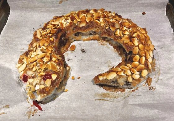 Щоб приготувати десерт, відокремте яєчні білки та відкладіть. Змішайте решту інгредієнтів (крім мигдальної стружки й вишні) до отримання однорідної маси. Викладіть тісто у формі змії на деко, застелене пергаментом. Випікайте 30 хвилин в розігрітій до 170 градусів духовці.