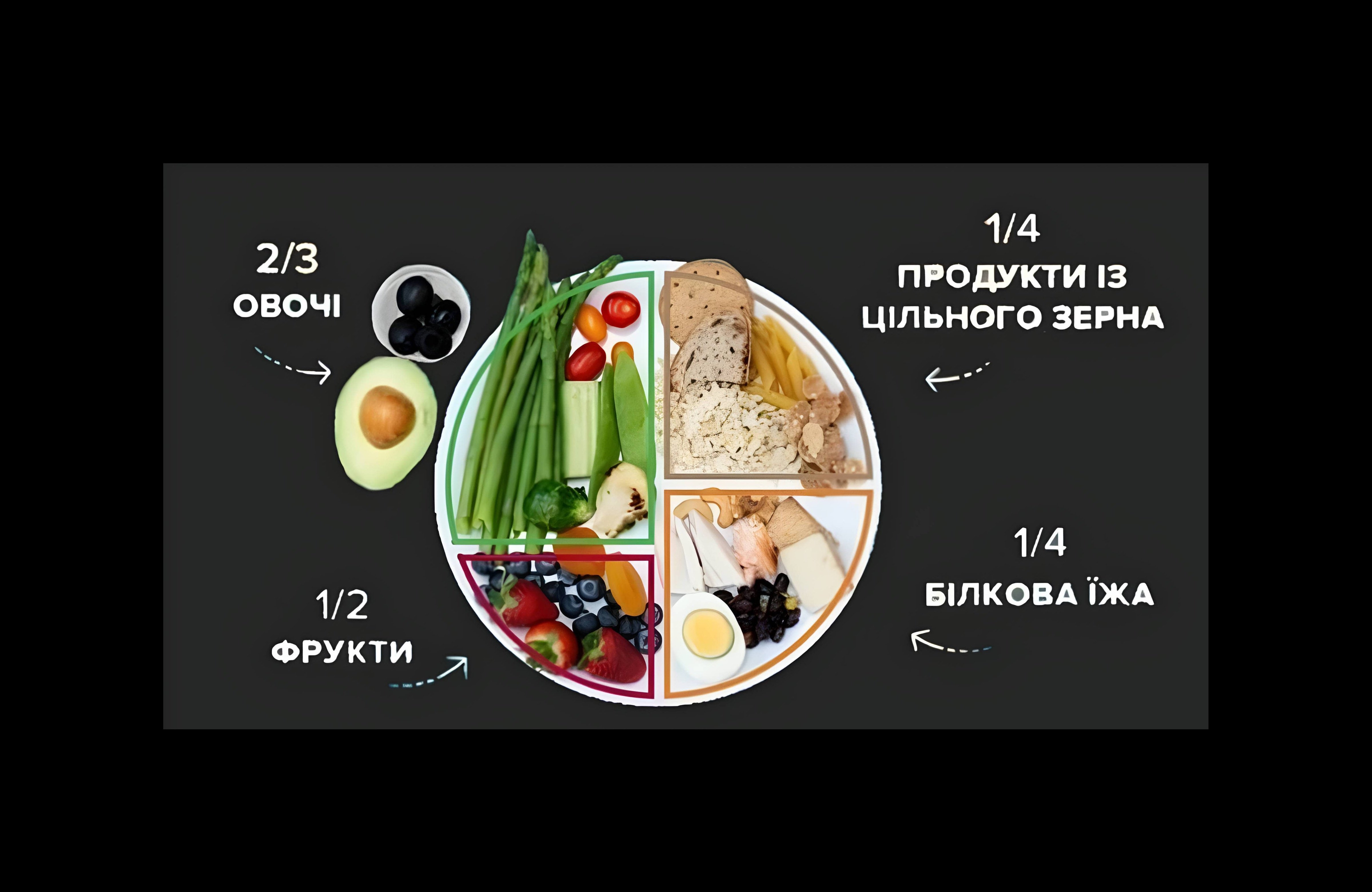 ¼ тарілки — гарнір зі складних вуглеводів (картопля, рис, макарони, гречка та ін.). Дотримання питного режиму протягом дня.