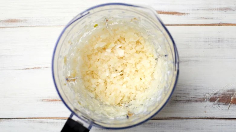 Максимально подрібнена в блендері цибуля перетворюється на білу рідину, схожу на молоко.