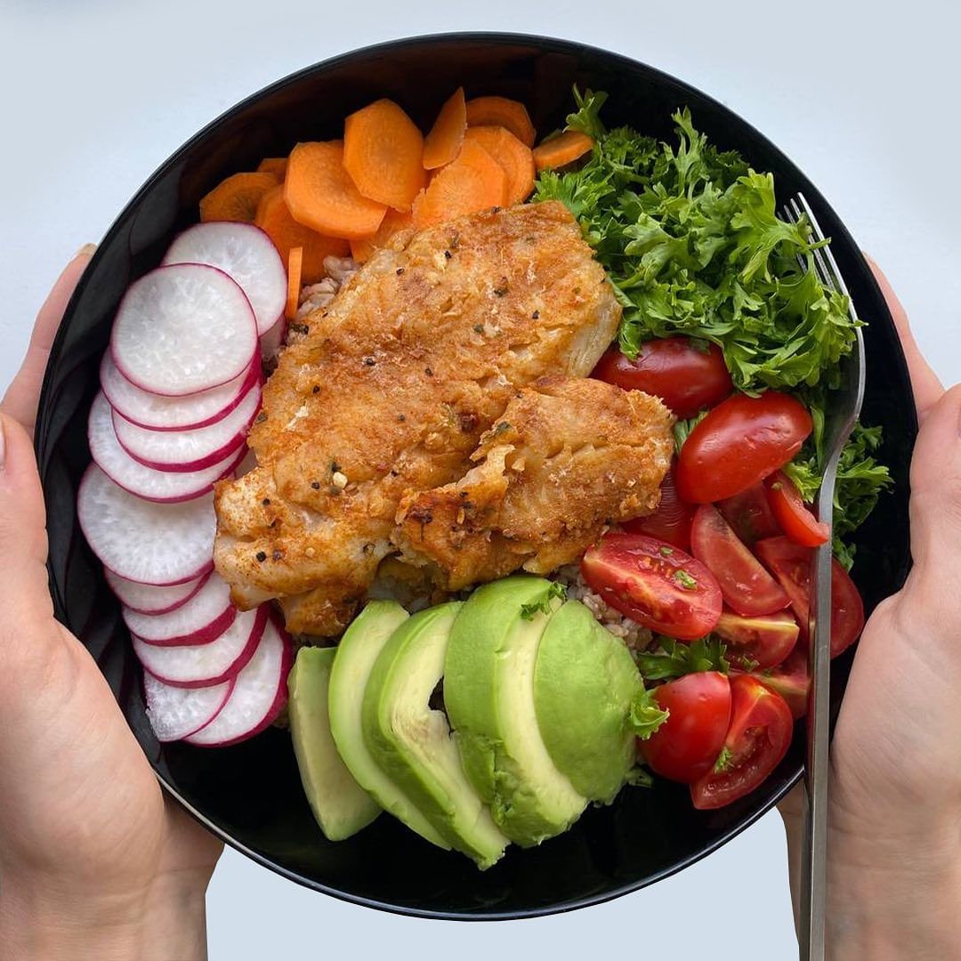 Тому з простих овочевих салатів перейдіть на кашові, де на дно миски викладаємо крупу, зверху додаємо овочі до свого смаку, а далі — рибку.