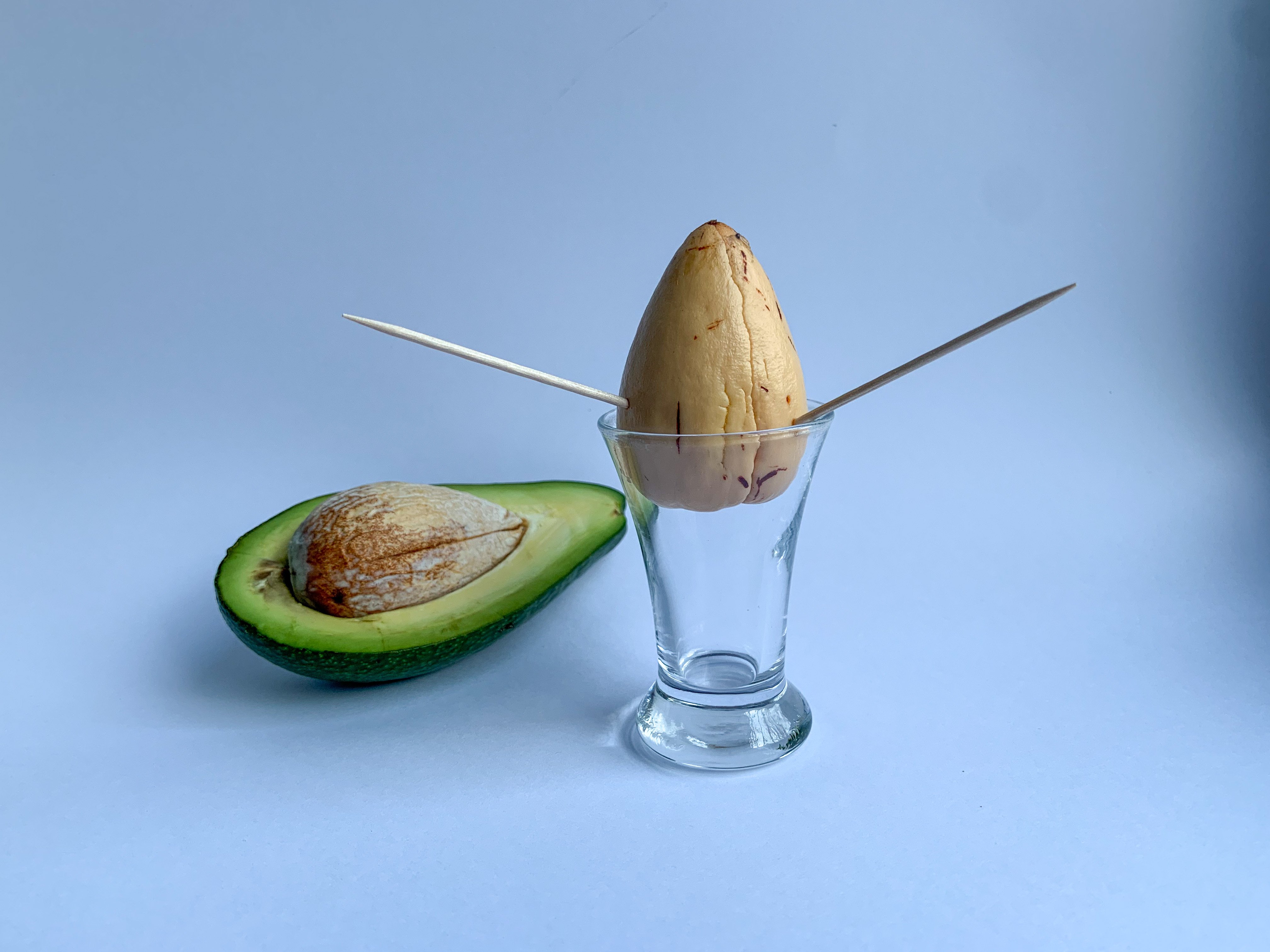 Помістіть кісточку авокадо в воду, так щоб кінчик, що містить зародок, торкався води, а решта кісточки трималася на поверхні за допомогою зубочисток.