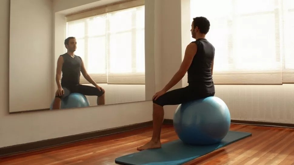 1. Сядьте на швейцарський мʼяч, щоб ви могли підняти ноги.