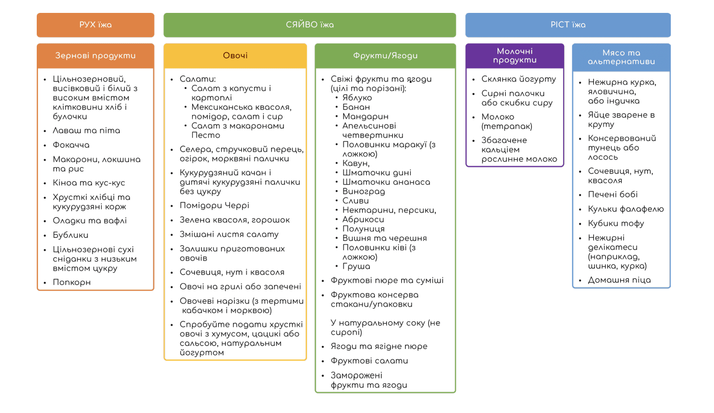 Щоб збалансувати дитячий ланчбокс, змішуйте та підбирайте різні продукти з кожної з п’яти груп продуктів.