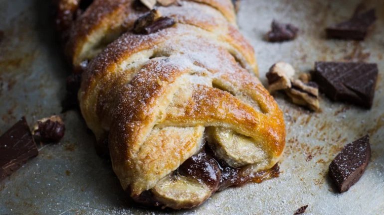 З розмороженого листкового тіста, змащеного з одного боку шоколадною пастою, зробіть трикутник, помістіть банан і зробіть рогалик. Перед випіканням змастіть заготовку яйцем, це допомагає підрумʼянити тісто та зробити його хрумким і блискучим.