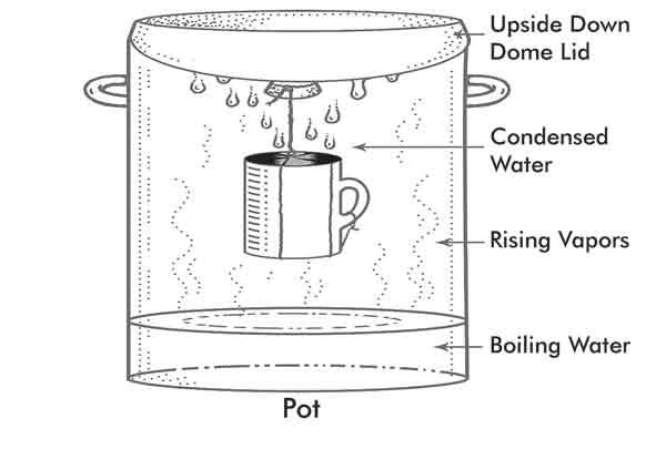 - Для дистиляції наповніть каструлю водою наполовину. Кришку каструлі переверніть, до ручки прив’яжіть чашку отвором догори. Переконайтеся, що чашка не бовтається, І кип’ятіть воду протягом 20 хвилин. Вода, що капає з кришки в чашку, дистилюється.