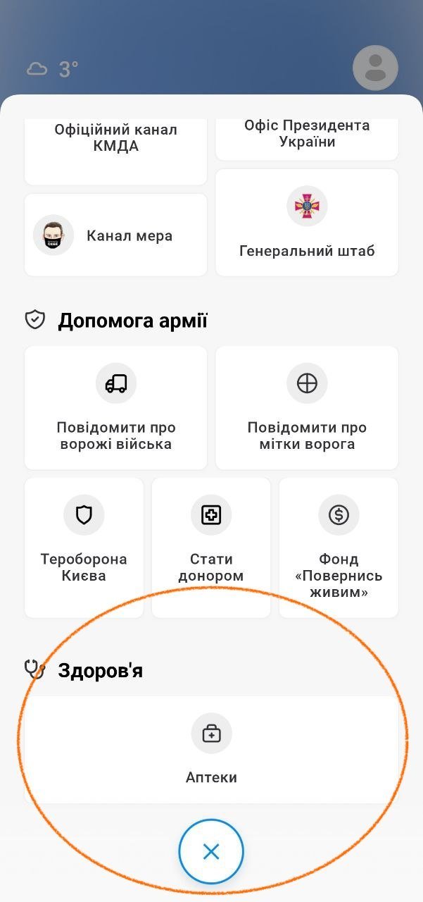У застосунку «Київ цифровий» для киян також додали мапу з локаціями аптек, які працюють. Інформація оновлюється в режимі реального часу. Щоб подивитися мапу, потрібно в застосунку натиснути внизу екрана на логотип застосунку, а потім перейти у розділ «Здоров’я».