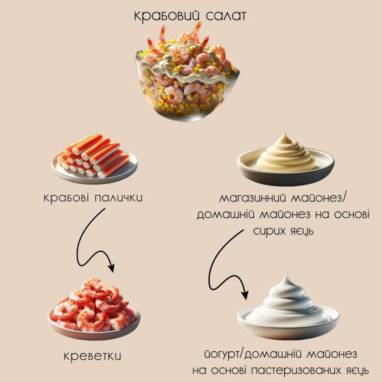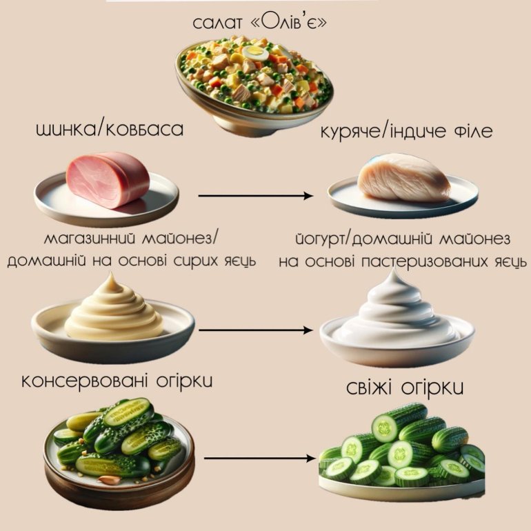 • такі популярні святкові страви, як оселедець, слабосолоний/копчений лосось, інша копчена риба, канапки з ікрою, салати на основі домашнього майонезу (в складі присутні сирі яйця), ковбасні вироби тощо. Всі ці продукти несуть серйозні ризики захворювань харчового характеру, на жаль, інколи з летальними наслідками;
