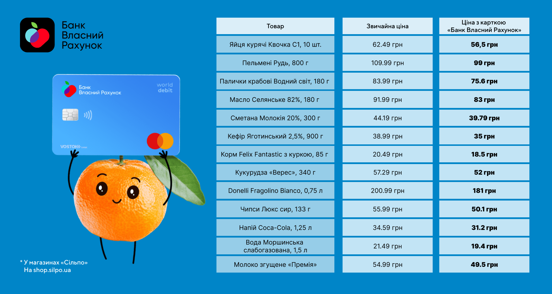 Якщо ви розраховуєтеся карткою «Банк Власний Рахунок» у «Сільпо», то отримуєте знижку 10% на понад 1000 топових товарів, потрібних нам щодня. Ось кілька прикладів: