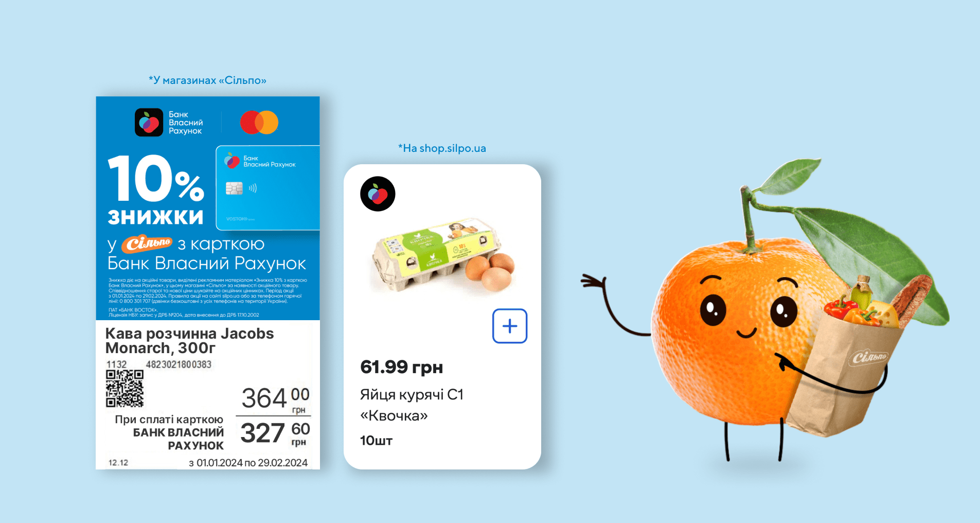 Якщо ви замовляєте товари на сайті «Сільпо» онлайн, то обирайте товари з позначкою у вигляді кольорового логотипу «Банк Власний Рахунок». Додавайте в кошик і сплачуйте карткою «Банк Власний Рахунок» онлайн.