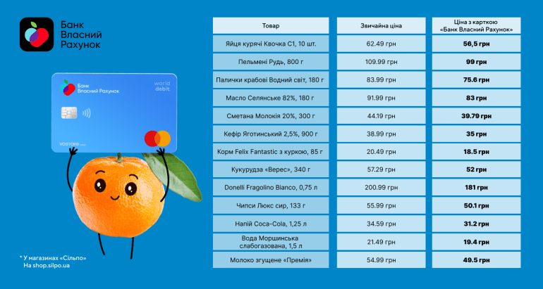 Загалом «Банк Власний Рахунок» — це вигідна картка для розрахунків у «Сільпо», з якою ви отримуєте більше балобонусів за покупки та ще й на додачу 10% знижки на 1000 топових товарів.