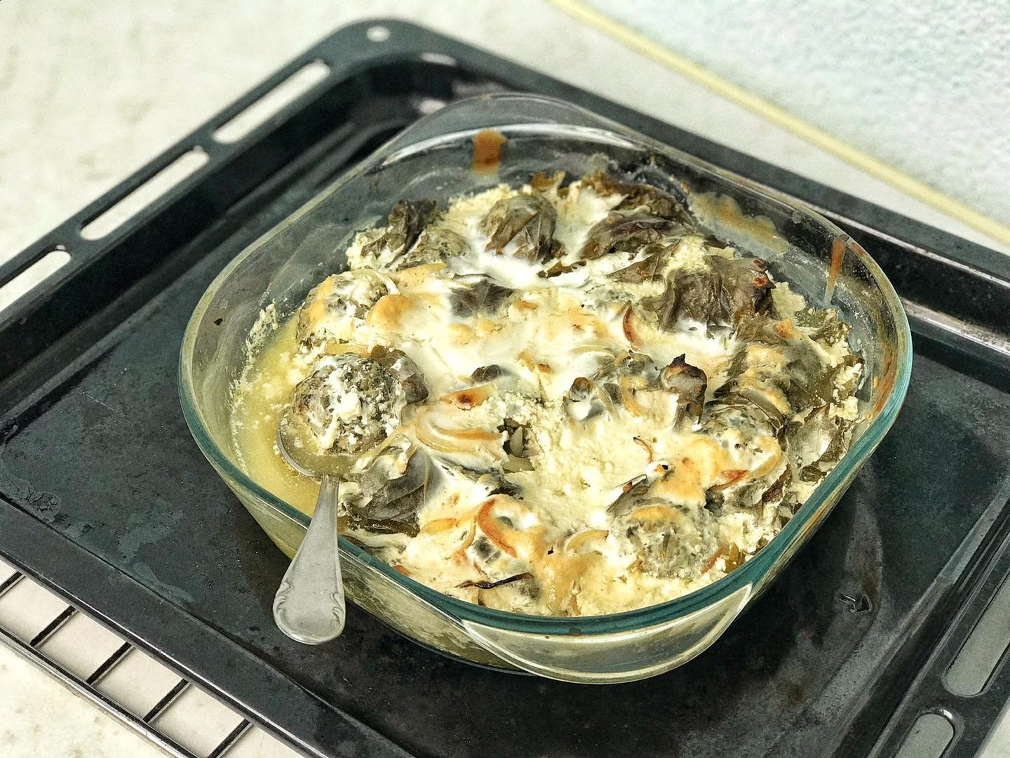 Лінива долма запікається в соусі зі сметани і вершків