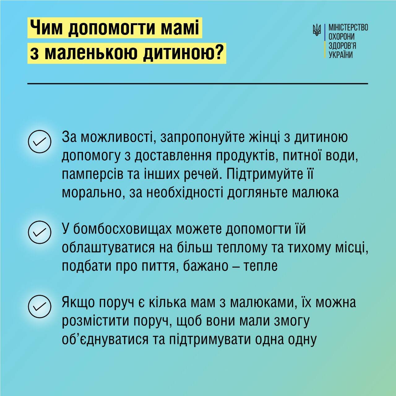 • Запропонувати допомогу з доставки продуктів, води, памперсів та необхідних речей для дитини.