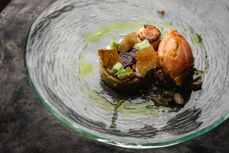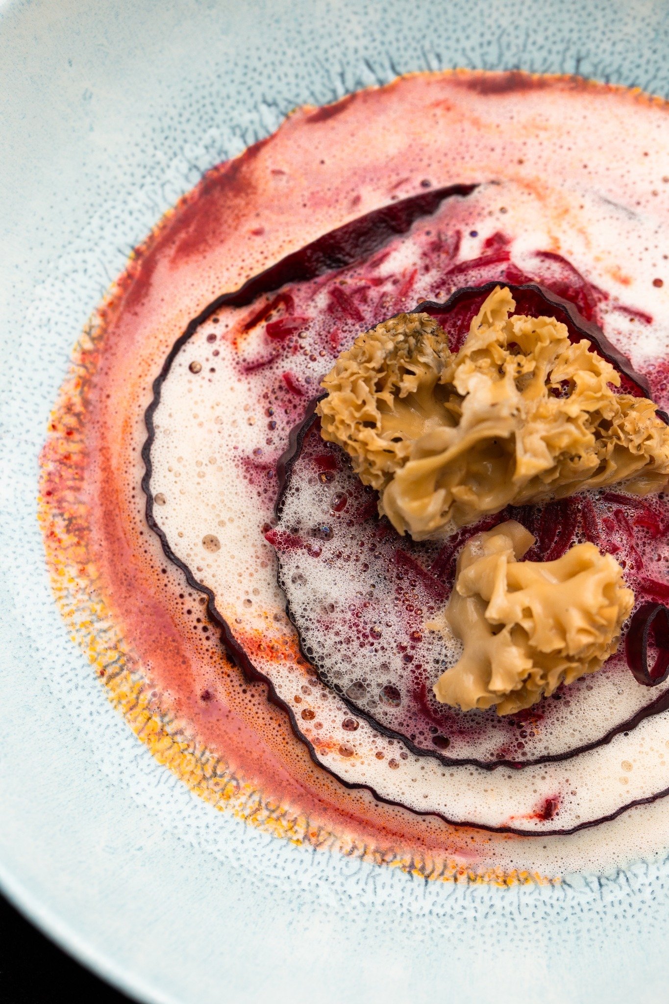 В кожній зі страв використовує оцей ферментований буряковий сік. Робить на ньому тісто для галушок, глазурує в ньому м’ясо, додаючи часниковий мед, пасту з фундука та bean to bar шоколад від сестер з Луцька.