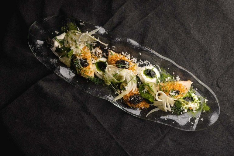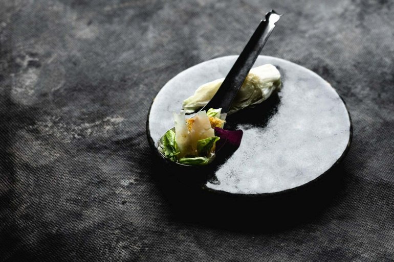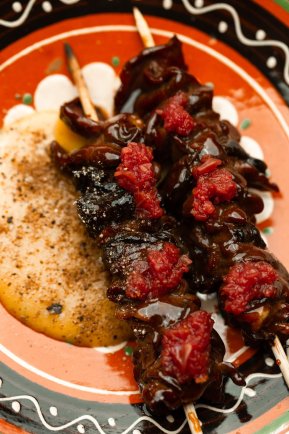 Артем Кабулахін (шеф-кухар без закладу, переможець «МастерШеф. Професіонали», 4 сезон — Ред.) поєднує локальні продукти та азійські техніки. Яловиче серце, мариноване у комбучі, смажиться, немов сатай на вулиці. Подає з грибами та грибним беарнезом.
