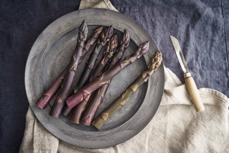 Перевага фіолетової спаржі в тому, що її найніжніші пагони можна їсти навіть сирими. Покришіть їх у легкий весняний салат і заправте оливковою олією і лимонним соком. Щоб зберегти яскравий фіолетовий колір спаржі, бланшуйте її так, як бланшують зелену (не забудьте про крижану ванну), а потім запечіть на грилі.