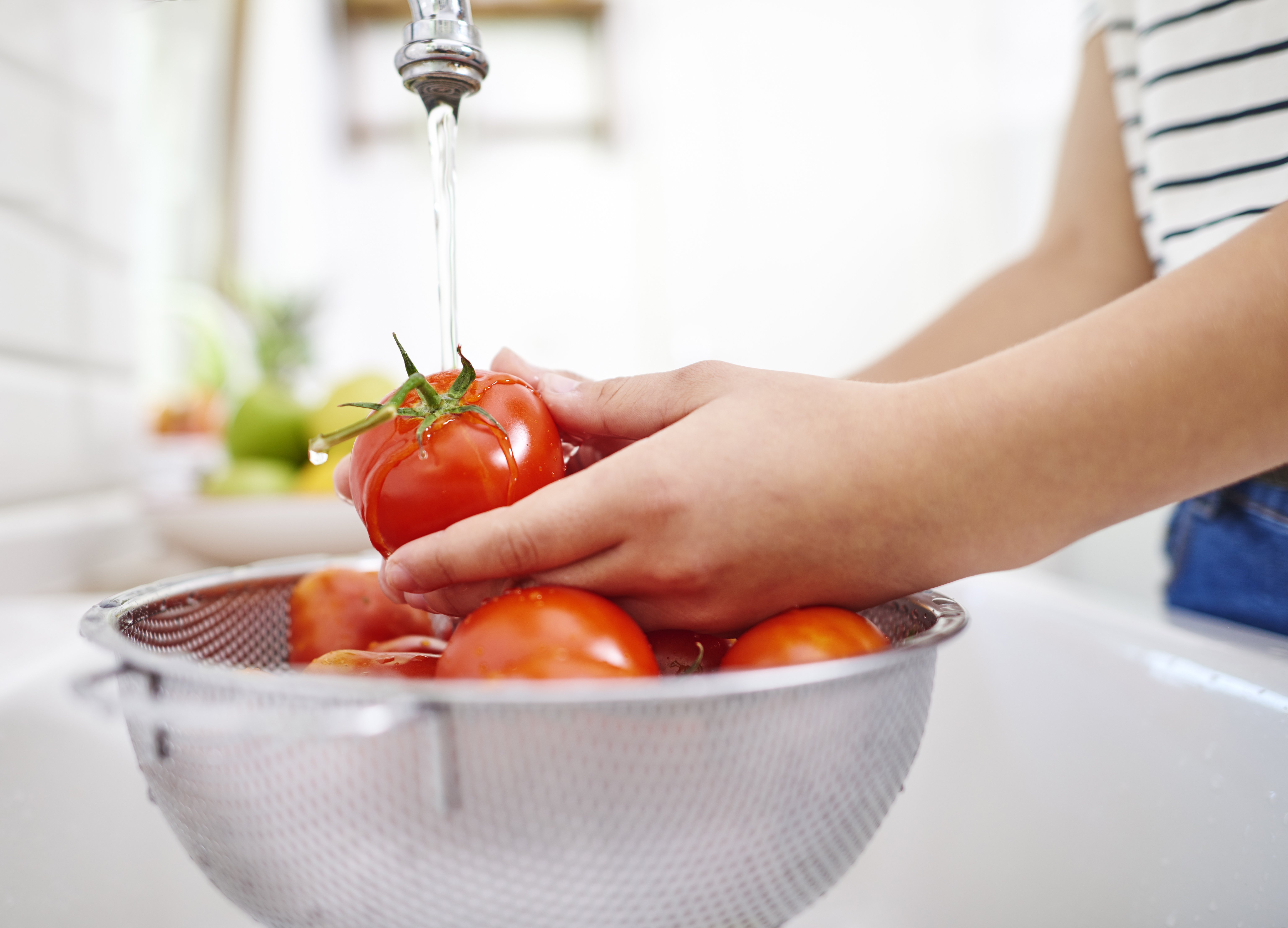 2. При митті складіть овочі або фрукти в друшляк і тримайте під проточною водою. Так видаляється більше пестицидів, ніж при зануренні у воду.