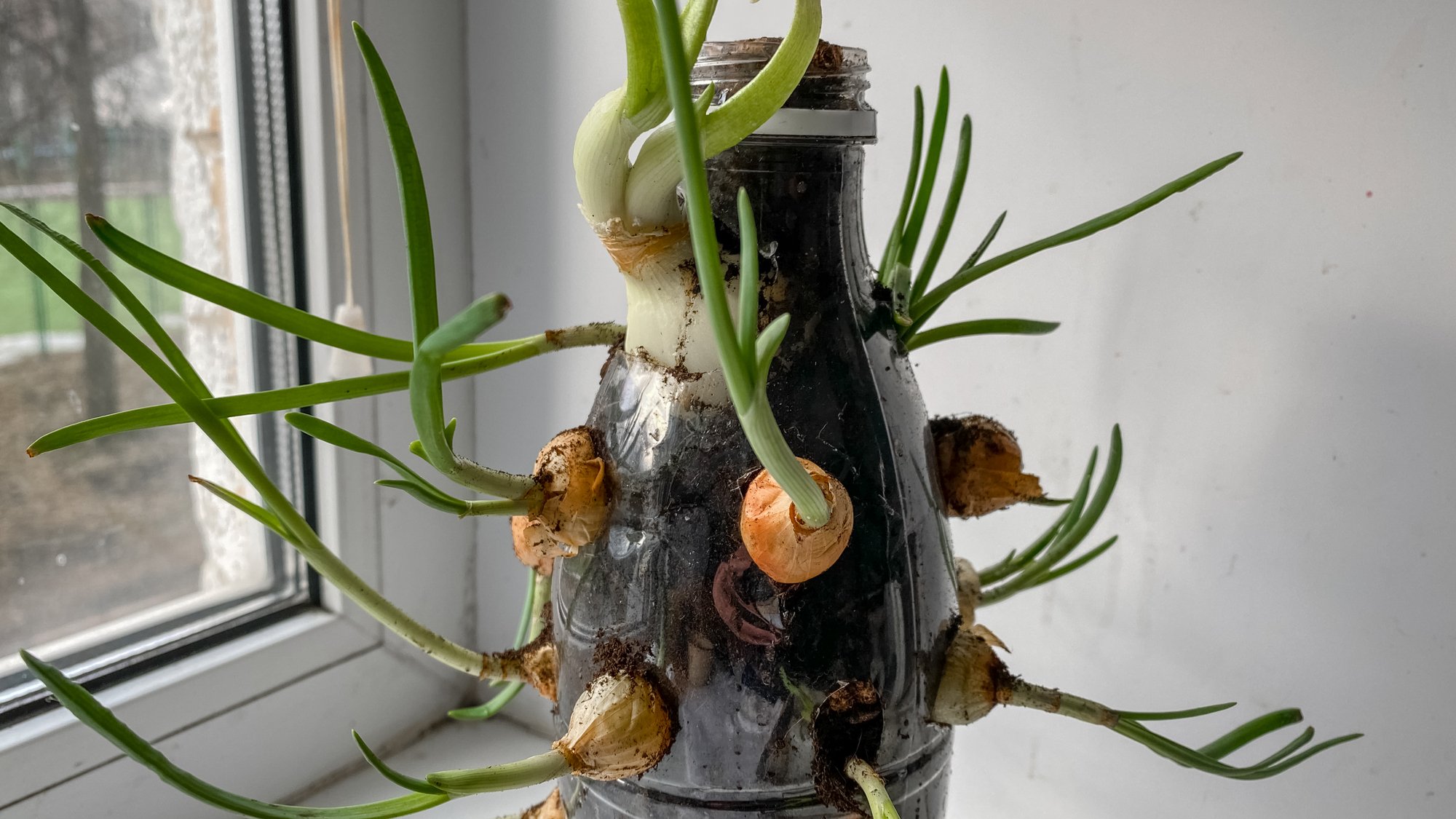 Посадити цибулю на підвіконні можна і більш оригінальним способом — вертикально в пластиковій пляшці! Для цього в обраній ємності треба вирізати кілька рядів дірочок приблизно на висоті 6-7 см від дна. Діаметр таких отворів не має перевищувати розмір цибулин, що висаджуються.