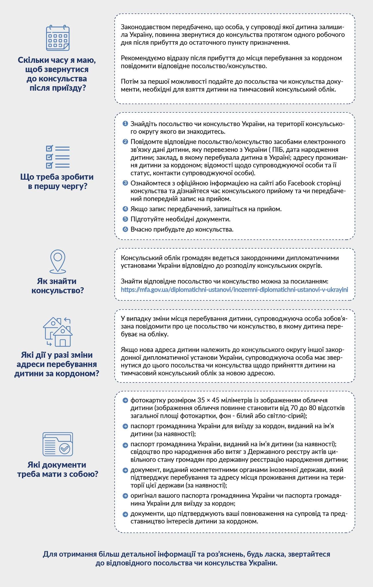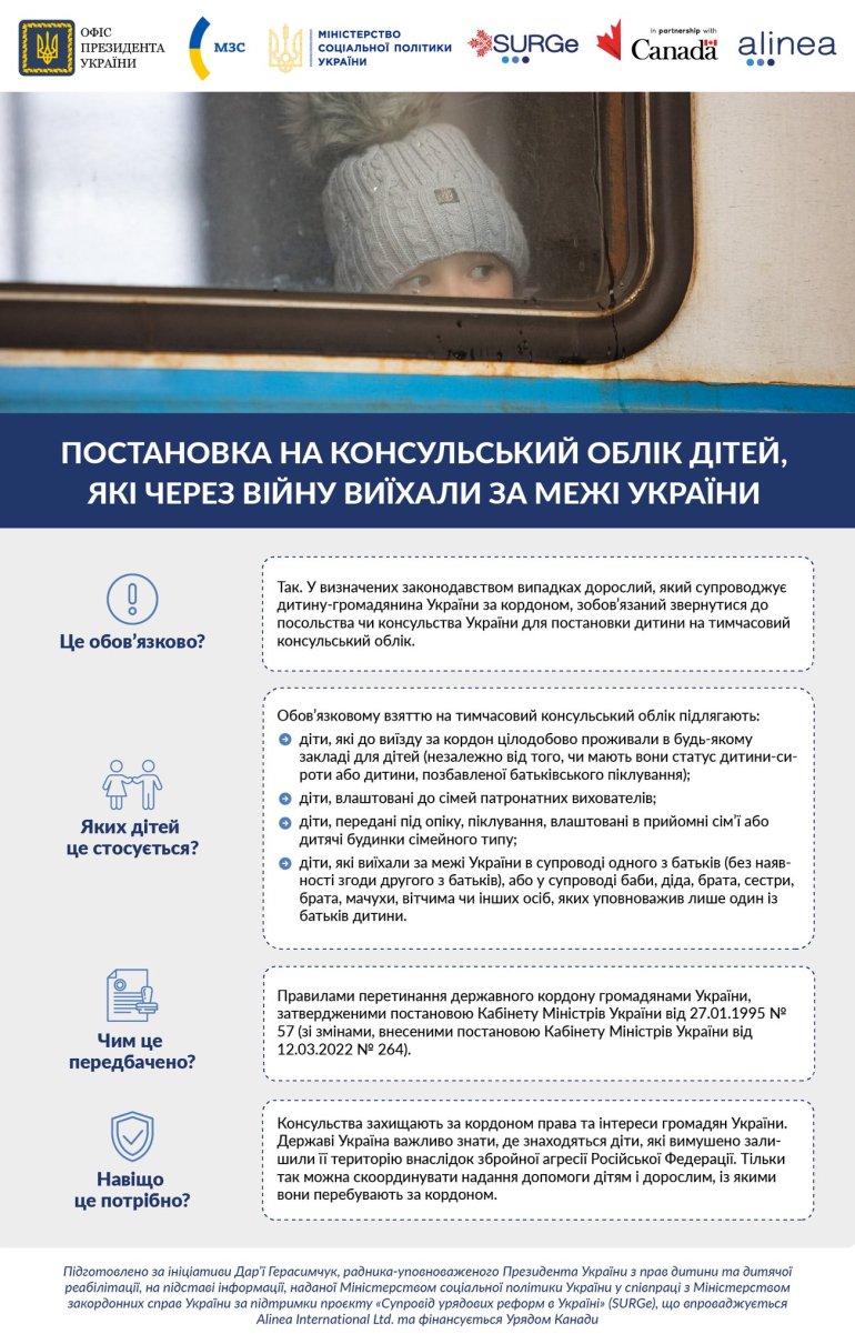 Дорослі, які супроводжують дитину - громадянина України за кордоном, зобов’язані звернутися до посольства або консульства України для постановки дитини на консульський облік.