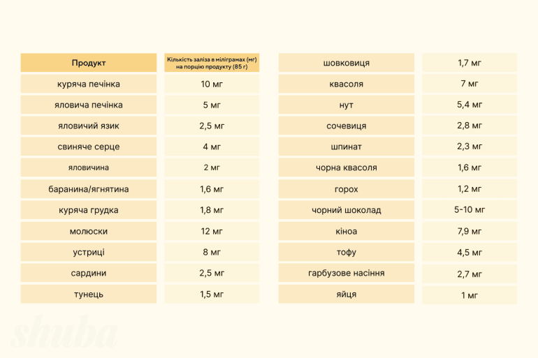 Експерти радять поєднувати декілька джерел мінералу, оскільки червоне м’ясо занадто жирне, а овочі та фрукти не забезпечують організм залізом у необхідних кількостях.