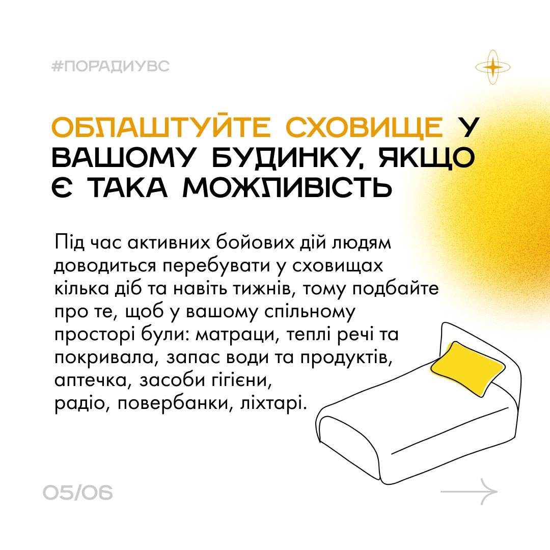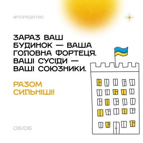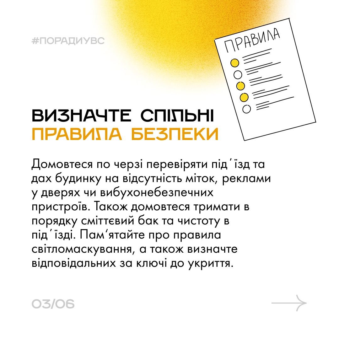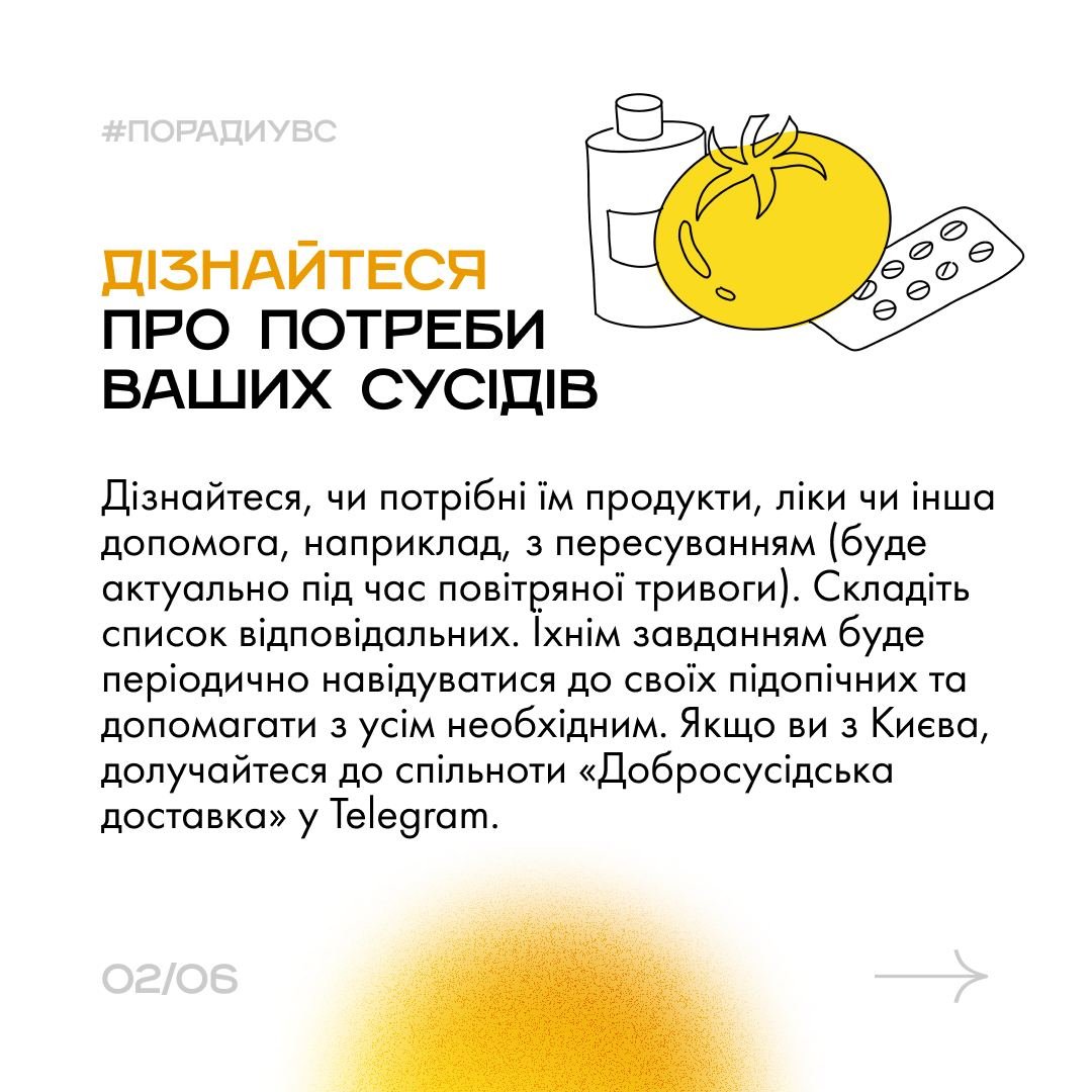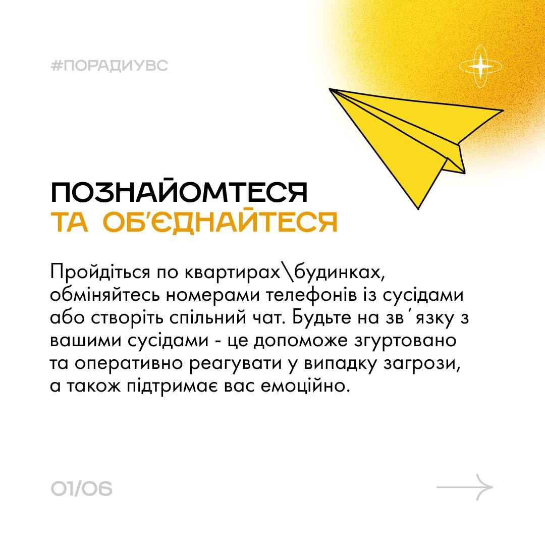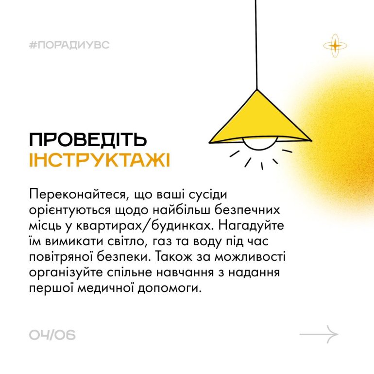 Переконайтеся, що ваші сусіди орієнтуються у найбезпечніших місцях у квартирах/будинках. Нагадуйте їм про необхідність вимикати світло, газ та воду під час повітряної тривоги. Також, за можливості, організуйте загальне навчання з надання першої медичної допомоги.