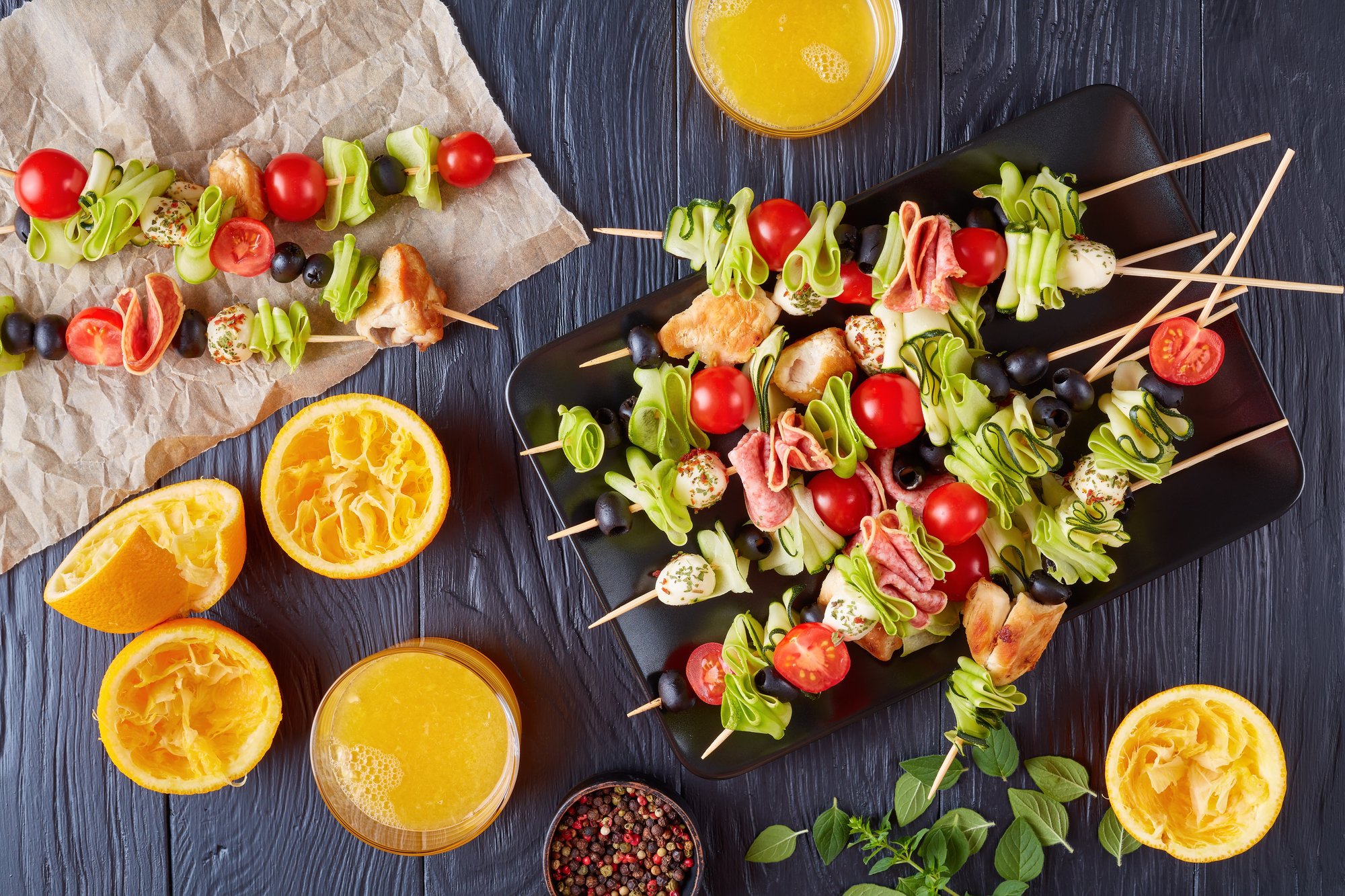 Закуски на шпажках подають перед основною стравою, ставлять на стіл або окремо, або разом із салатами.