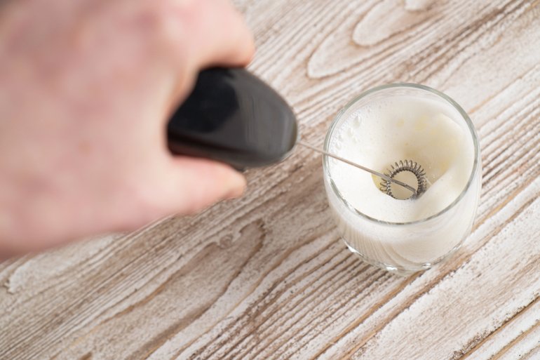 Спінювачі молока не займають багато місця на кухні, працюють від двох батарейок, а свою роботу виконують на відмінно. Просто підігрійте трохи молоко, занурте в нього спінювач під кутом 45 градусів і натисніть на кнопку.