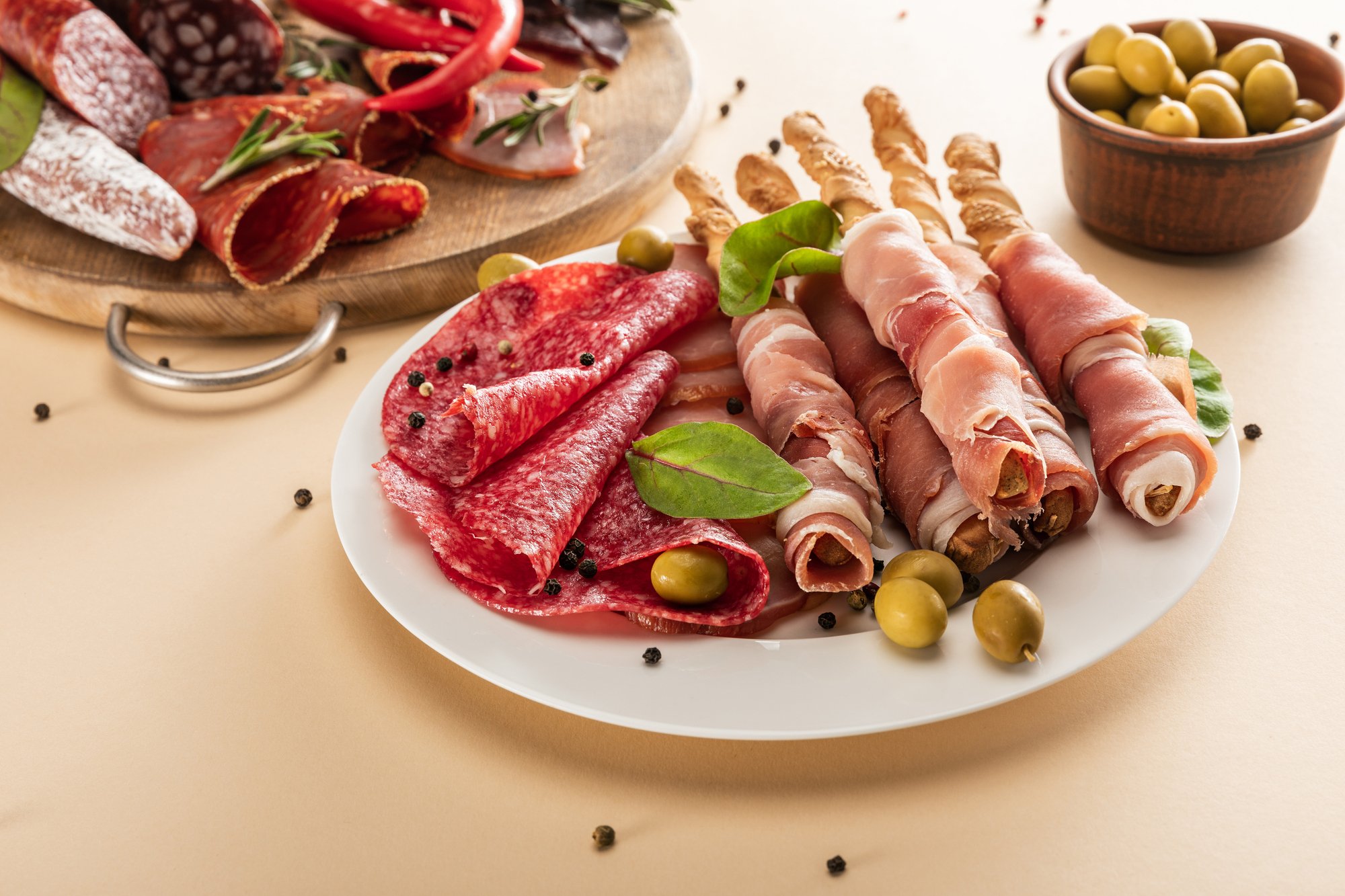 На м’ясній дошці хамон добре доповнити оливками, а замість хліба можна подати його із хрусткими хлібними паличками.