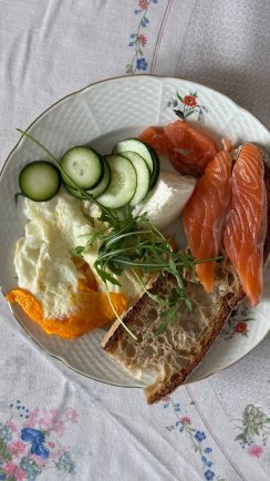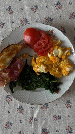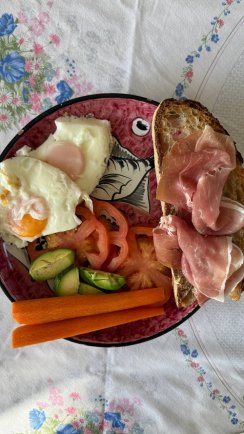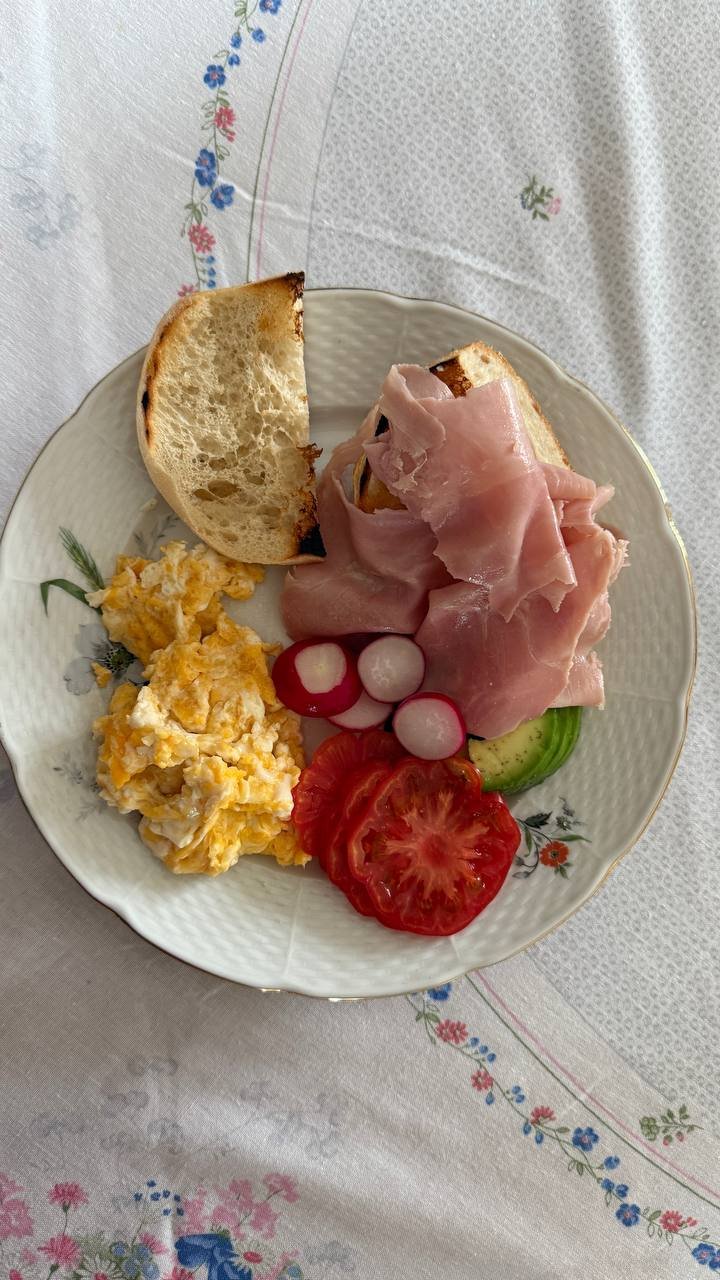 Я люблю солоні сніданки. Це можуть бути яйце, хліб, трохи авокадо, прошуто/мортадели/лікарської ковбаси, сиру. З овочів — фенхель, морква, перець. Іноді хочеться солодкого — можу піти в заклад і з’їсти круасан, оладки, капкейки, сирник, йогурт із варенням або медом. Але таке буває десь двічі на місяць.