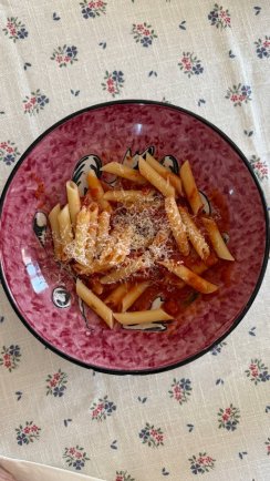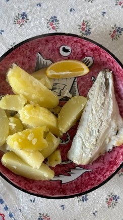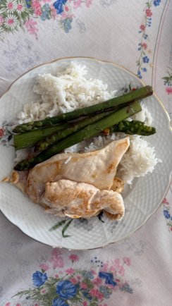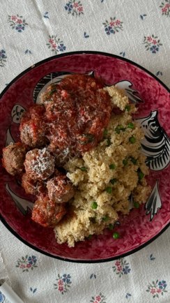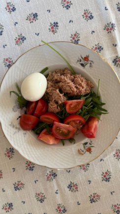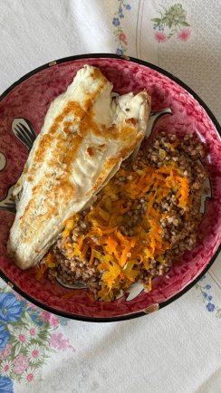 На обід намагаюся їсти вуглеводи (макарони, кускус, рис, гречку) та білки (курка, індичка, кролик, дорадо на грилі або тушкована скумбрія). Овочі — у вигляді салату або гриль, якщо хочеться і вони пасують до страви.