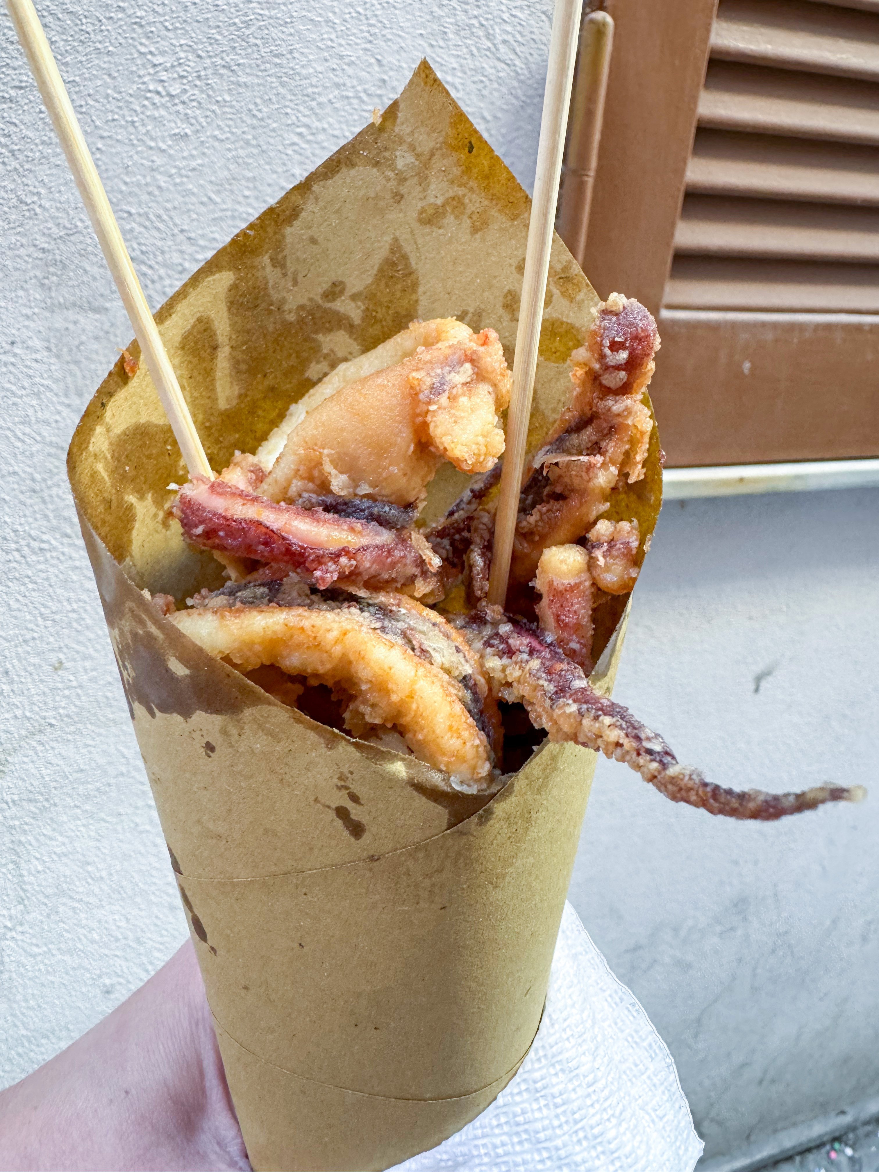 Морепродукти у фритюрі в паперовому конвертику. Хто пригадає, в останні роки срср та на початку буремних 90-х соняшникове насіння в ролі снеків ще не було бізнесом. Тобто було, але виробником, постачальником і ритейлером «сємок» була сусідська бабуся в одній особі. Вона згортала конусом шматок газети й всипала туди склянку пузатого насіння щойно з пательні. Пригадуєте свої емоції в цей момент? От десь так само почуваєшся, коли продавець у Неаполі насипає тобі в крафтовий конверт щедру порцію обсмажених у фритюрі креветок, мідій, кальмарів і картопляних крокетів.