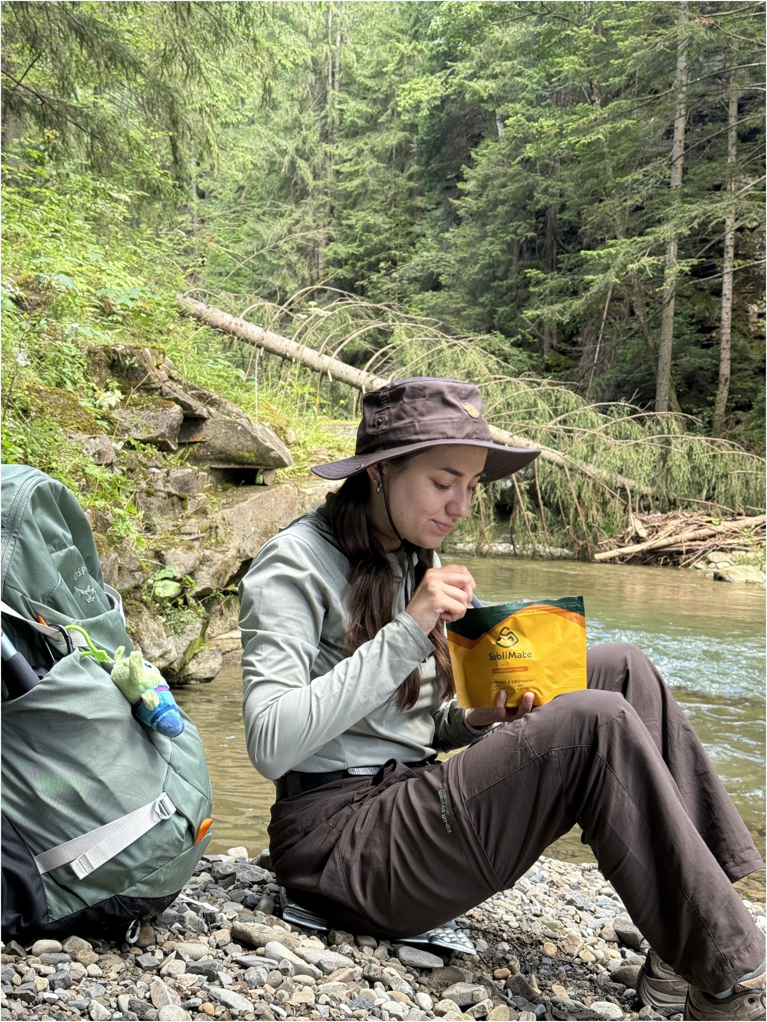 У походи я ходжу активно з липня 2024 року. У мене є певний список улюблених субліматів, і, якщо це одноденний похід, я беру одну пачку з ними та перекуси. Якщо планується ночівля, тоді на один день я беру 3 пачки субліматів, декілька батончиків із сухофруктами та щось солодке. Щодо перекусів, то в мене це батончики із сухофруктів, кабаноси, люблю дуже сухарики із зеленню. Ще підсіла на желейки.