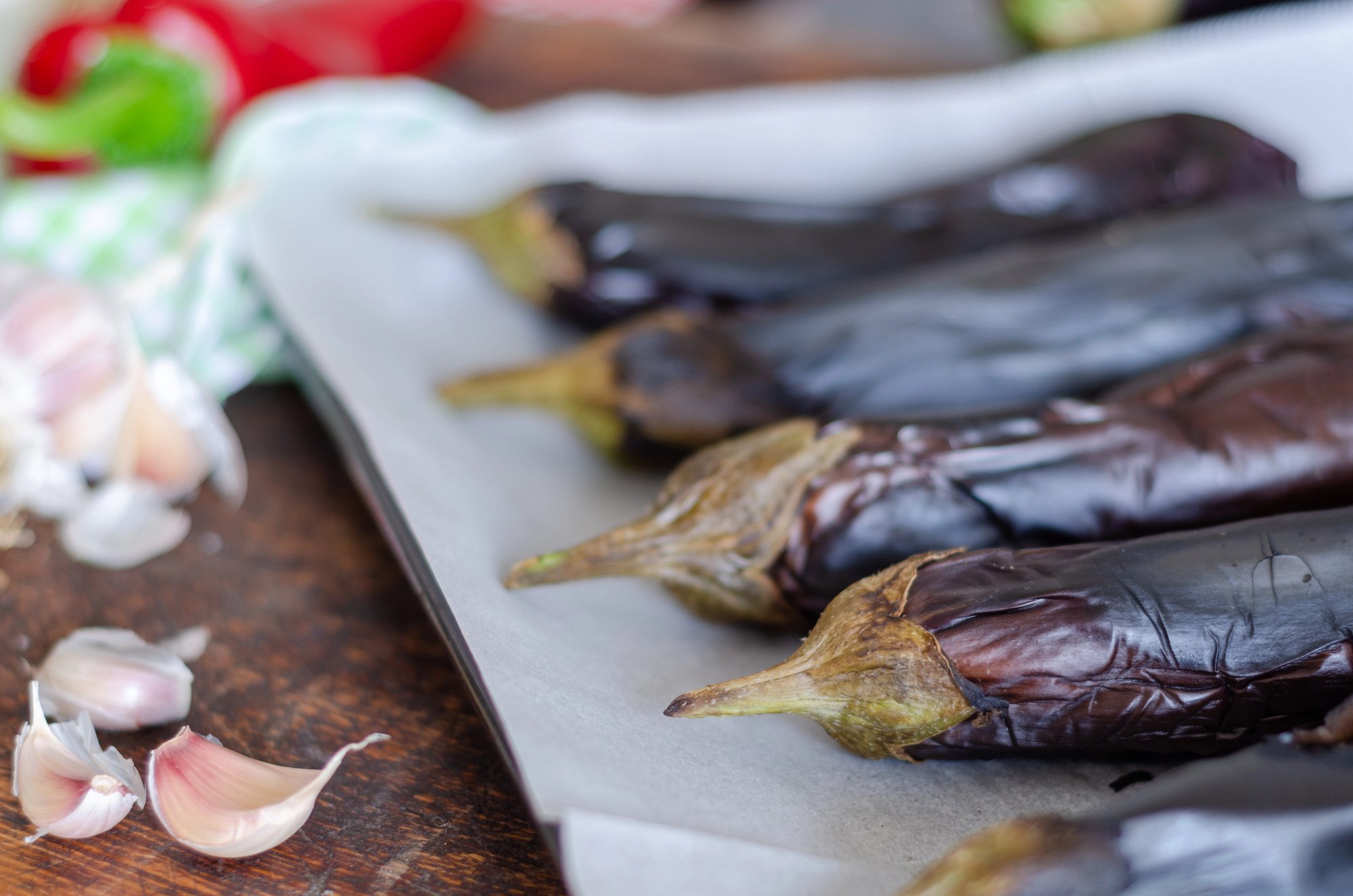 Охолоджуємо за кімнатної температури. Обережно видаляємо шкірочку. Якщо баклажан добре пропечений, шкірка має легко зніматись.