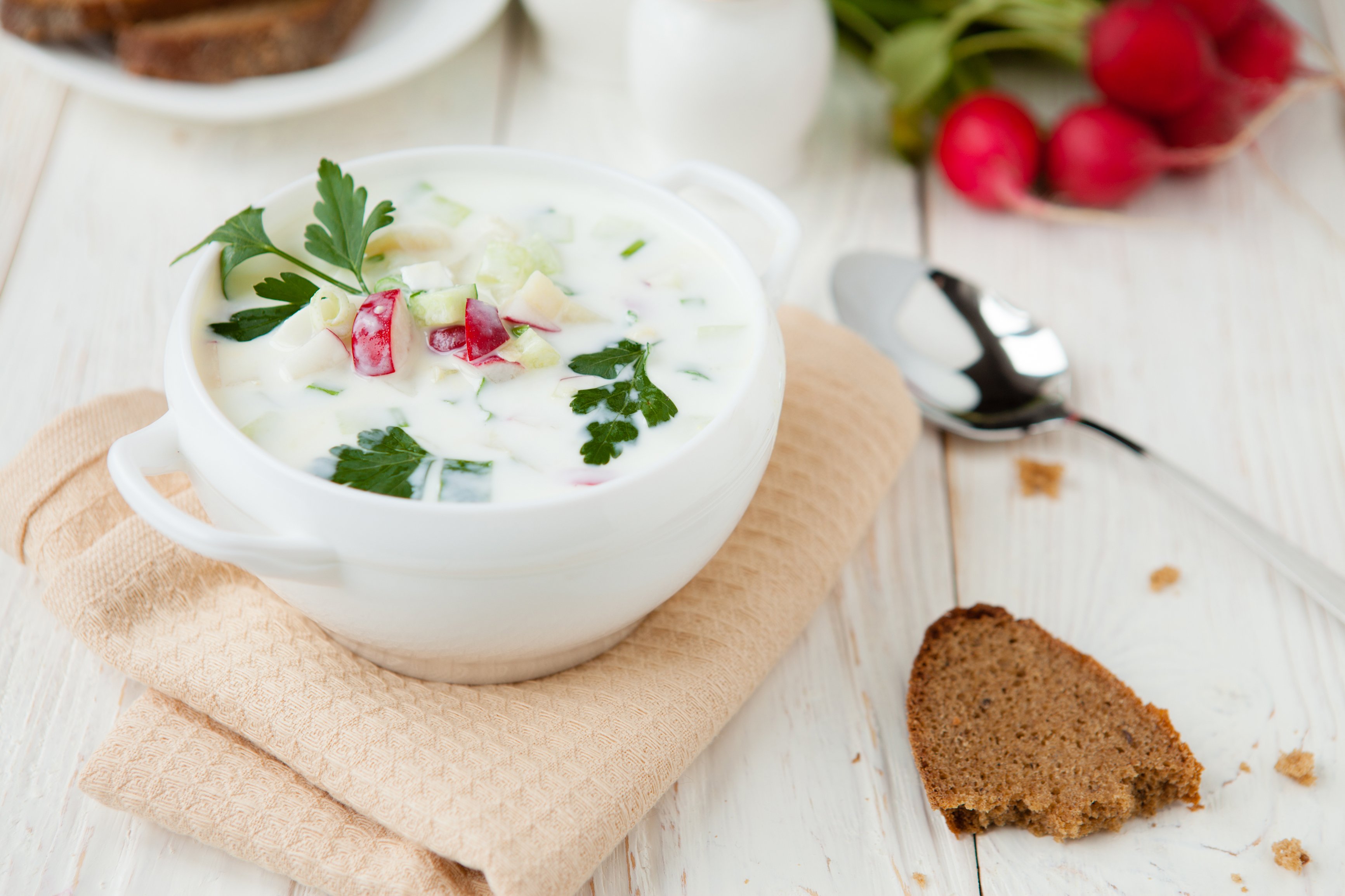 Такий чудовий суп стане окрасою будь-якого понеділка, адже в ньому є все: і ніжна варена картопля, і терпкий редис і солоні мариновані огірки під кисломолочною заправкою, і запашна зелень. Додавайте до супчику відварене куряче філе або шинку та насолоджуйтесь!