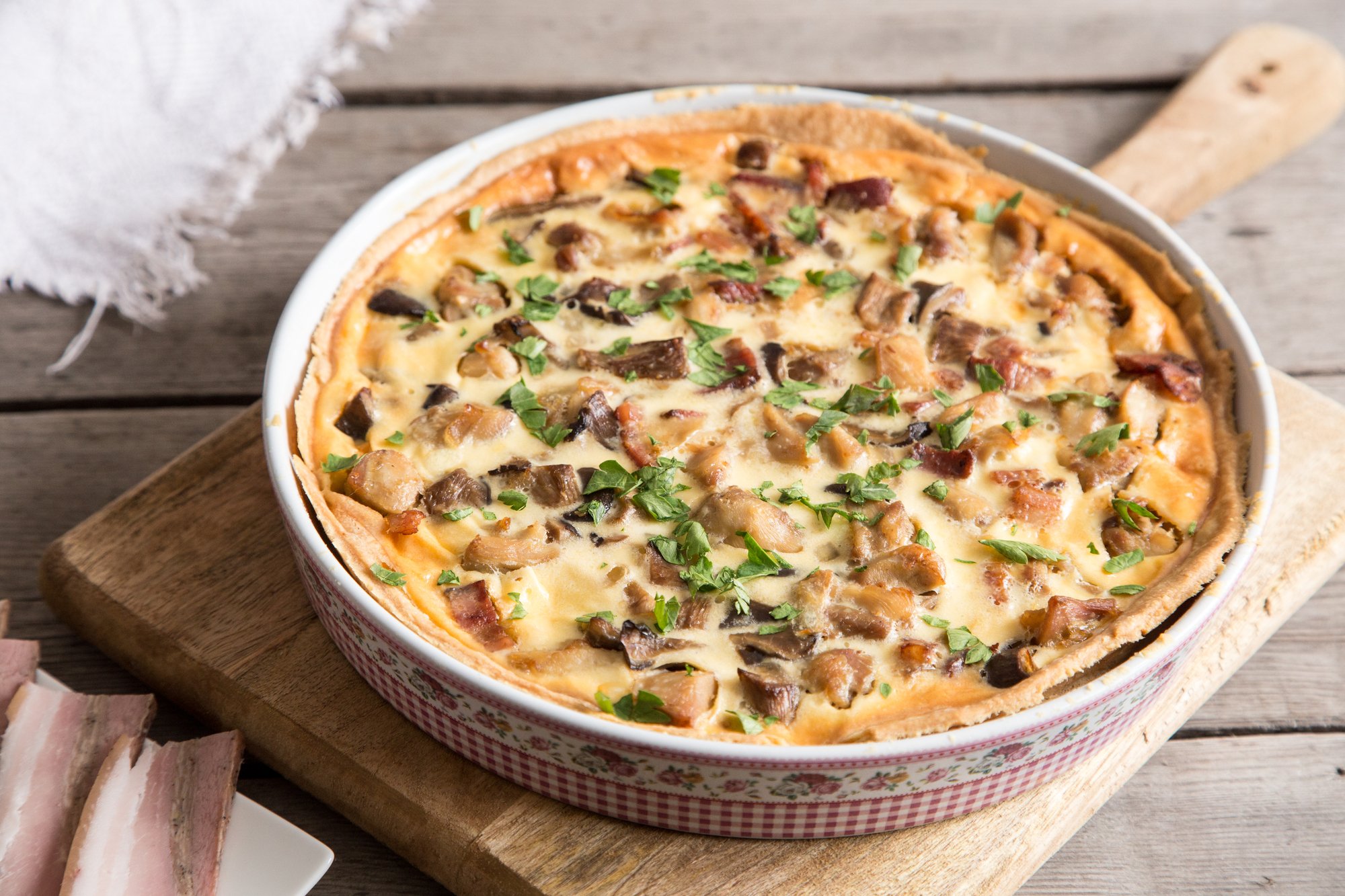 «Фішка» пирога — заливка з яєць, молока та сиру, яка потім гусне при випічці. Одним із найпопулярніших є саме кіш з куркою та грибами, рецепт якого пропонуємо ми.