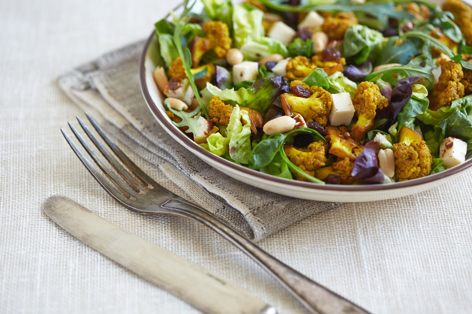 Теплий салат з цвітною капустою — це мікс овочів та заправки з медом та родзинками. Салат прикрашають бланшованим мигдалем та подають окремою стравою.