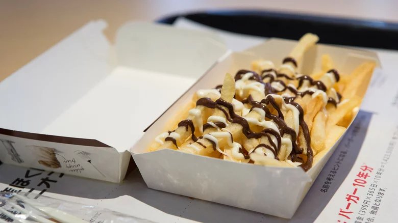 Це японський креатив. Продавався в ресторанах Макдональдс і, до речі, коштував недешево. Картоплю гарно поливали соусом з білого та молочного шоколаду.
