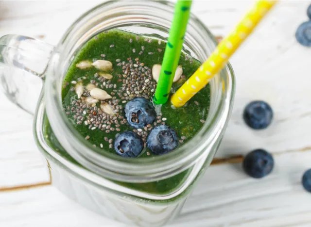 У складі чудодійного напою є протеїновий порошок, насіння льону та чіа, трохи мигдальної олії та молока, шпинат. За бажанням можна додати кілька кубиків льоду та прикрасити смузі чорницею.