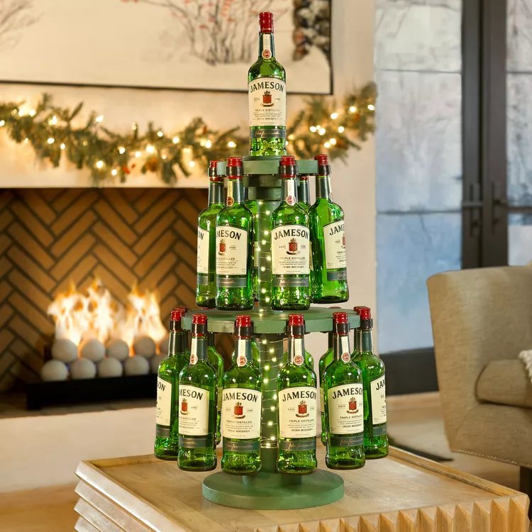 Таке «різдвяне дерево» вигадала компанія Jameson Irish Whiskey, повідомляє Foodandwine. Конструкція заввишки 90 сантиметрів складається з 19 пляшок ірландського віскі Jameson. Цей оригінальний атрибут має вбудоване освітлення, яке заповнить кімнату теплим зеленим світлом.