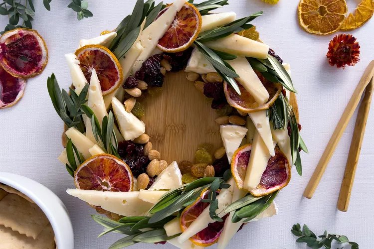 На фото видно, що його легко зробити в домашніх умовах. У складі цього вінка три різні види сиру, один із них мʼякий вершковий. Також додано каліфорнійський мигдаль, кільця сушеного апельсина, сушену вишню, родзинки, крекери, свіжу зелень.