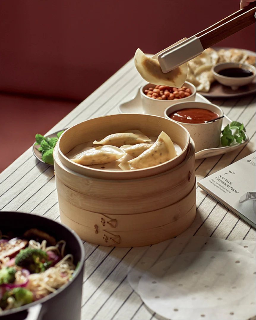 Так само як і найпростішою, звичною нам пароваркою. Щоби під час приготування продукти не прилипали до бамбукової основи, радять застелити її пергаментом або капустяним листям, якщо готуєте солоні страви.