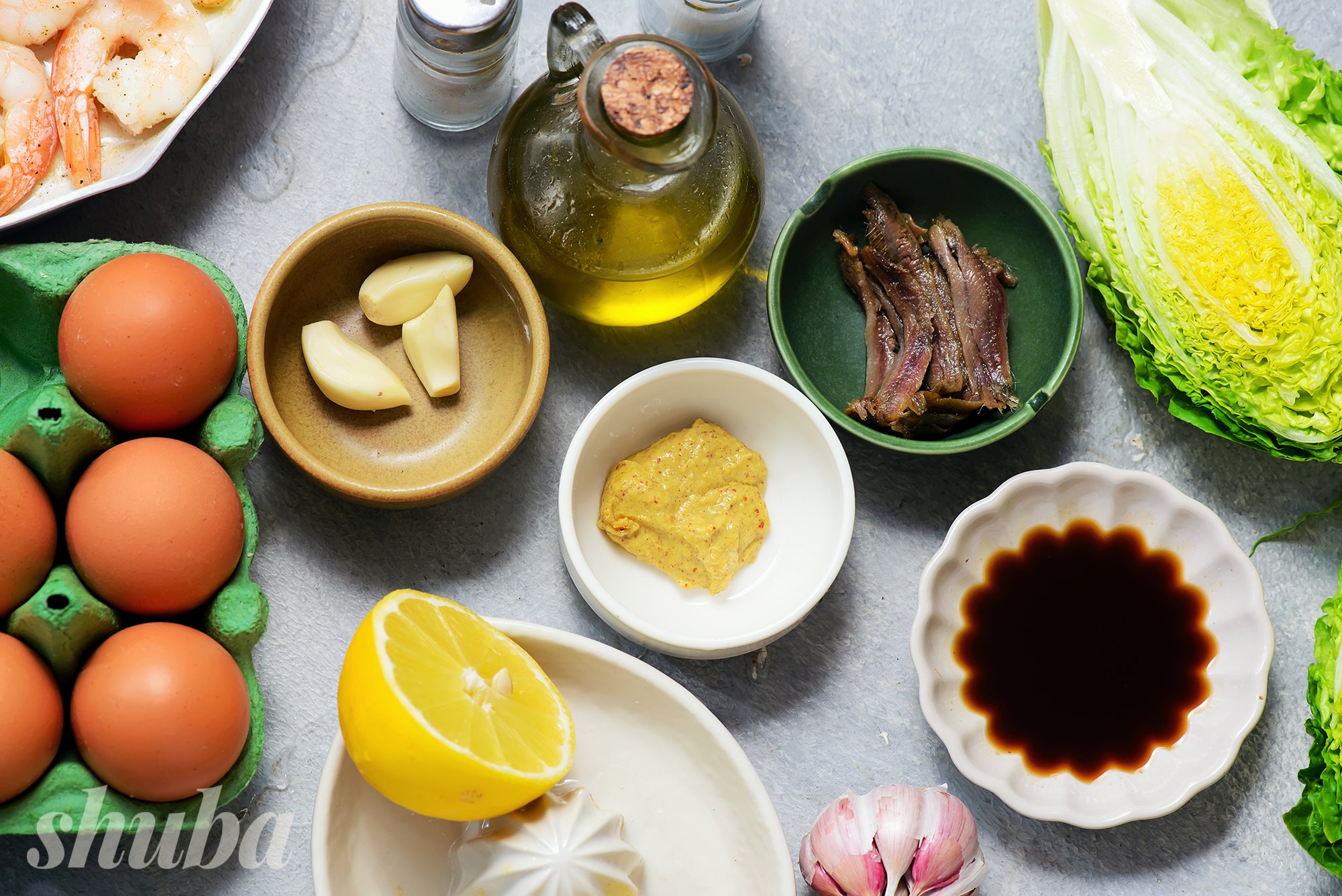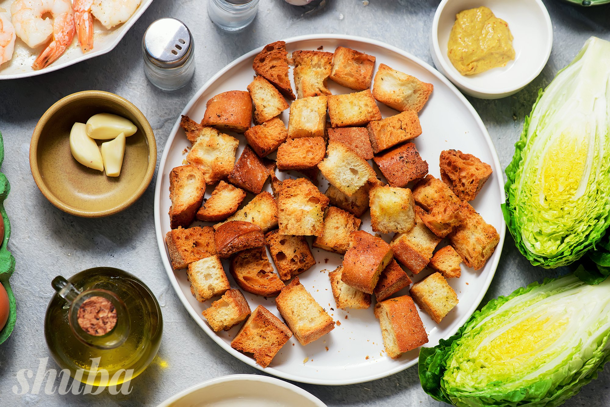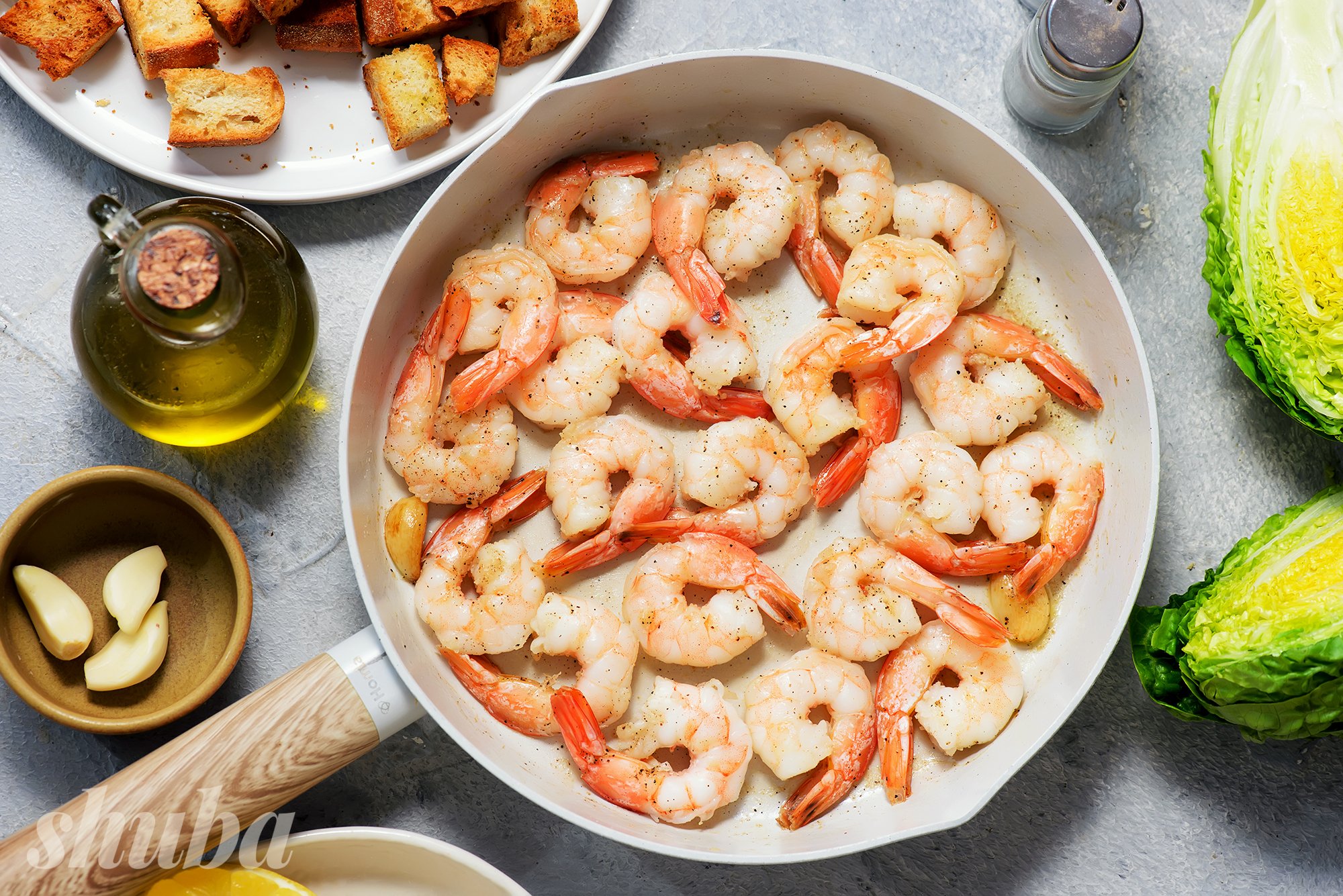 SHUBA пропонує смачний варіант салату «Цезар» — з креветками. До речі, для салату можна приготувати креветки фламбе за рецептом шефа Юрія Ковриженка (а ще це незабутнє фаєр-шоу для твоїх гостей).