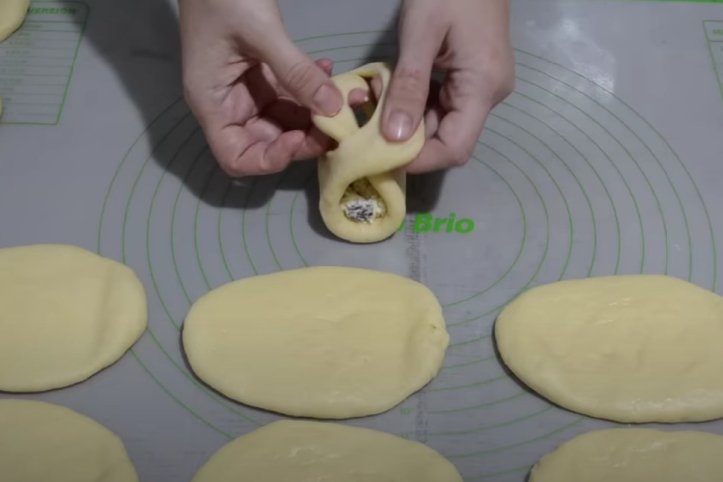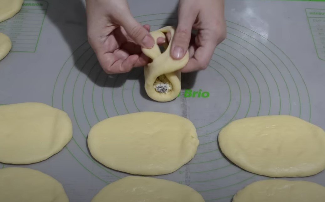 Тісто, що підійшло, викладіть на робочу поверхню, присипану борошном. Розкатайте в пласт завтовшки до 1 см та формочкою або склянкою виріжте кружальця. Зробіть два розрізи по боках кружалець один навпроти одного. Викладіть начинку та сформуйте пиріжки, як показано на фото.