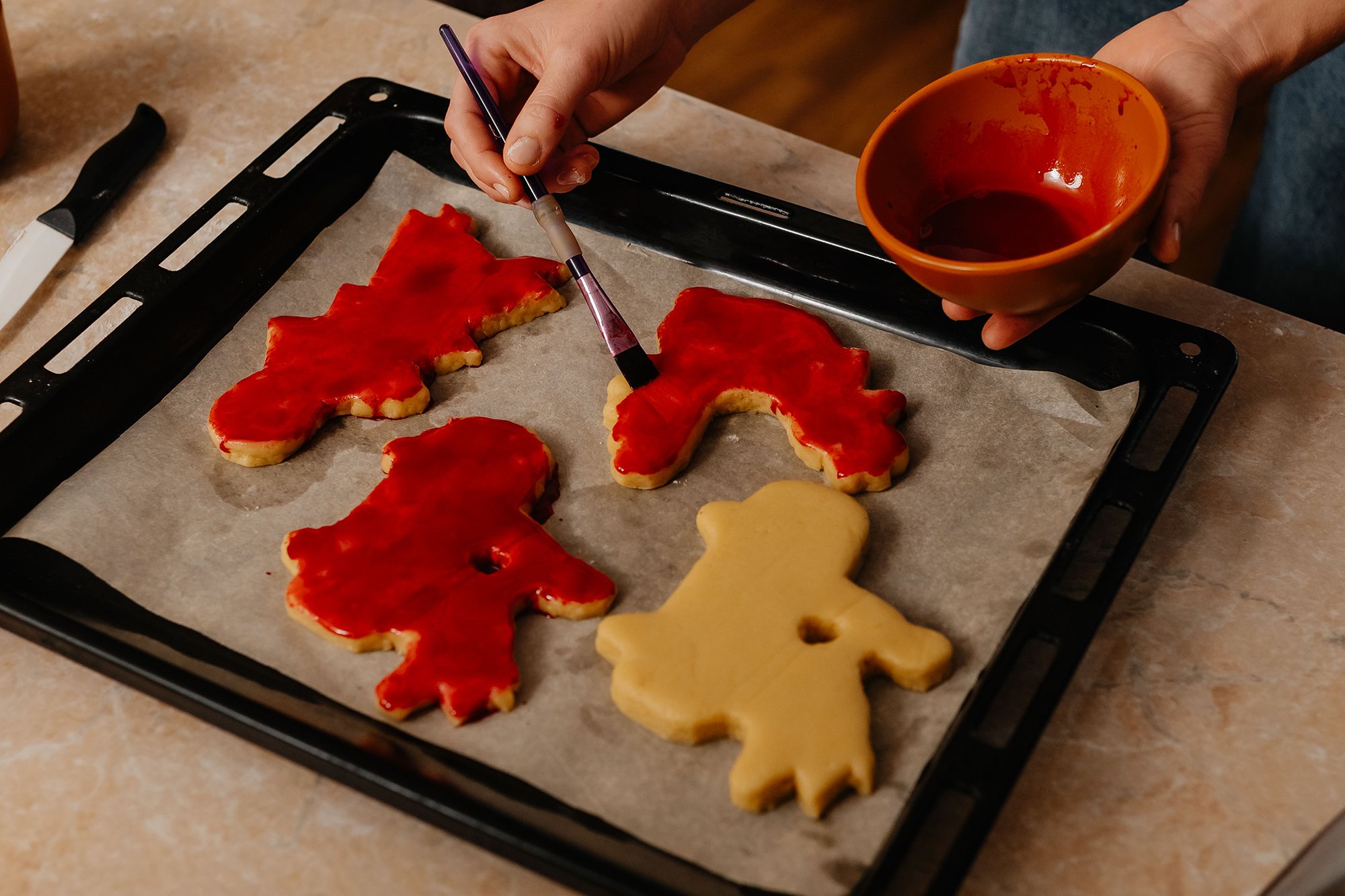 Якщо хочете розписати коржики іншими кольорами, використовуйте природні барвники. Для жовтого кольору додайте до білої глазурі куркуму, для зеленого — сік шпинату.