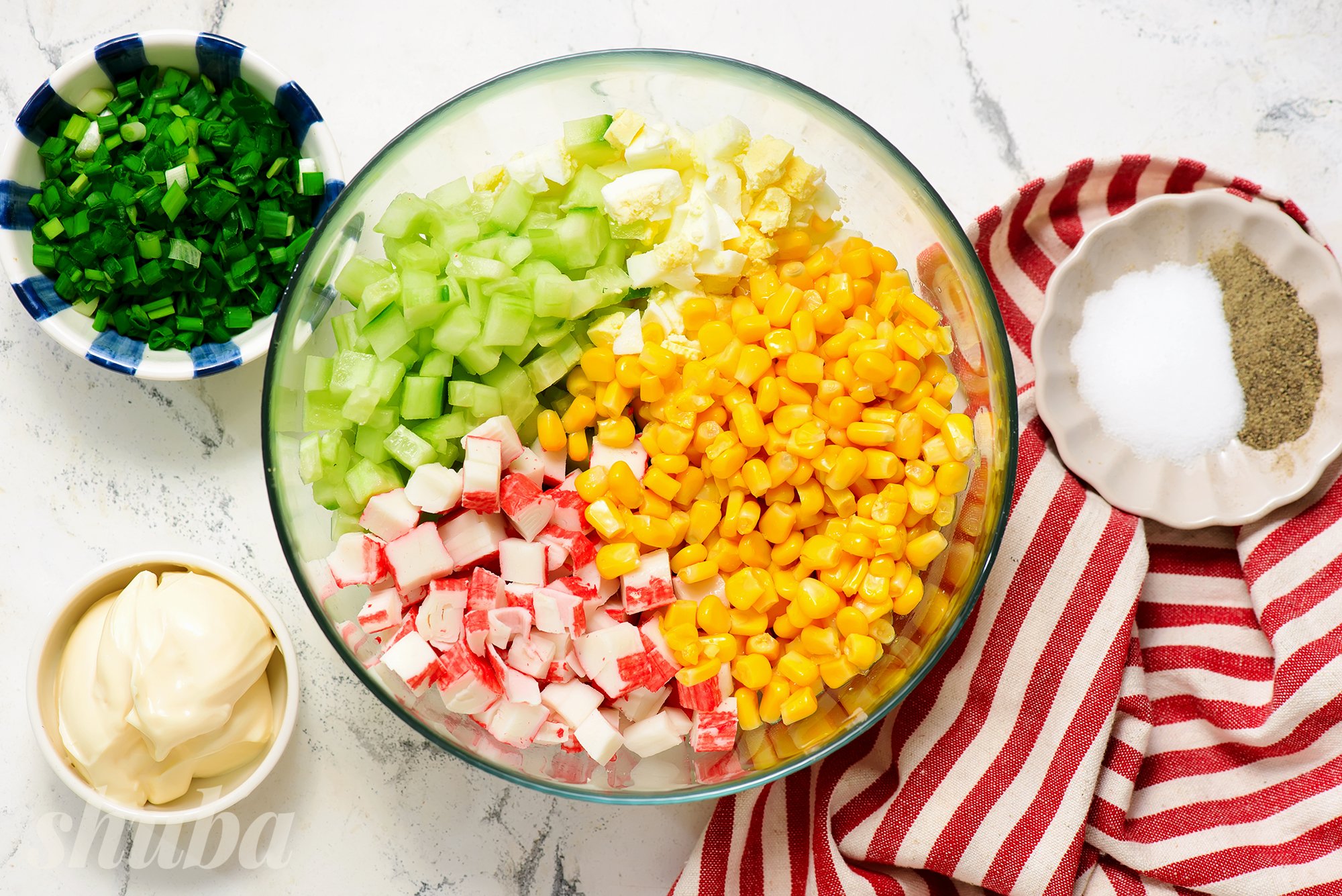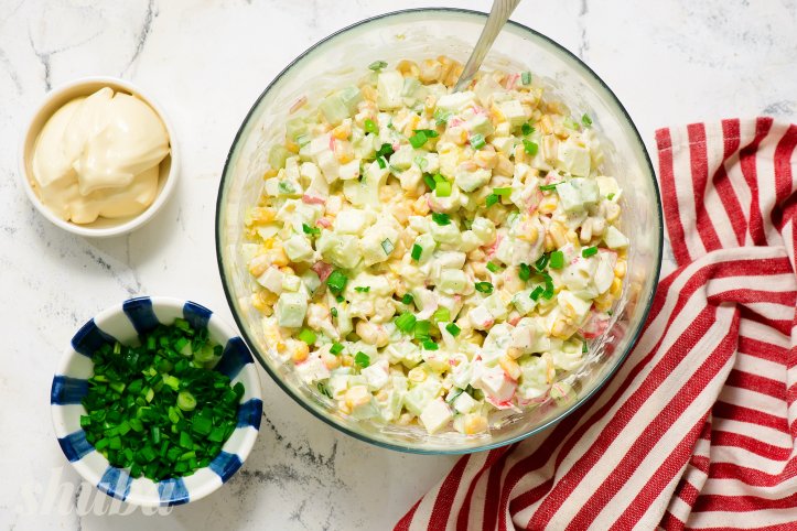 Усе починається з вибору якісних крабових паличок. Зазвичай у салат їх нарізають середнім кубиком. Ще один невідійманий інгредієнт — консервована кукурудза.