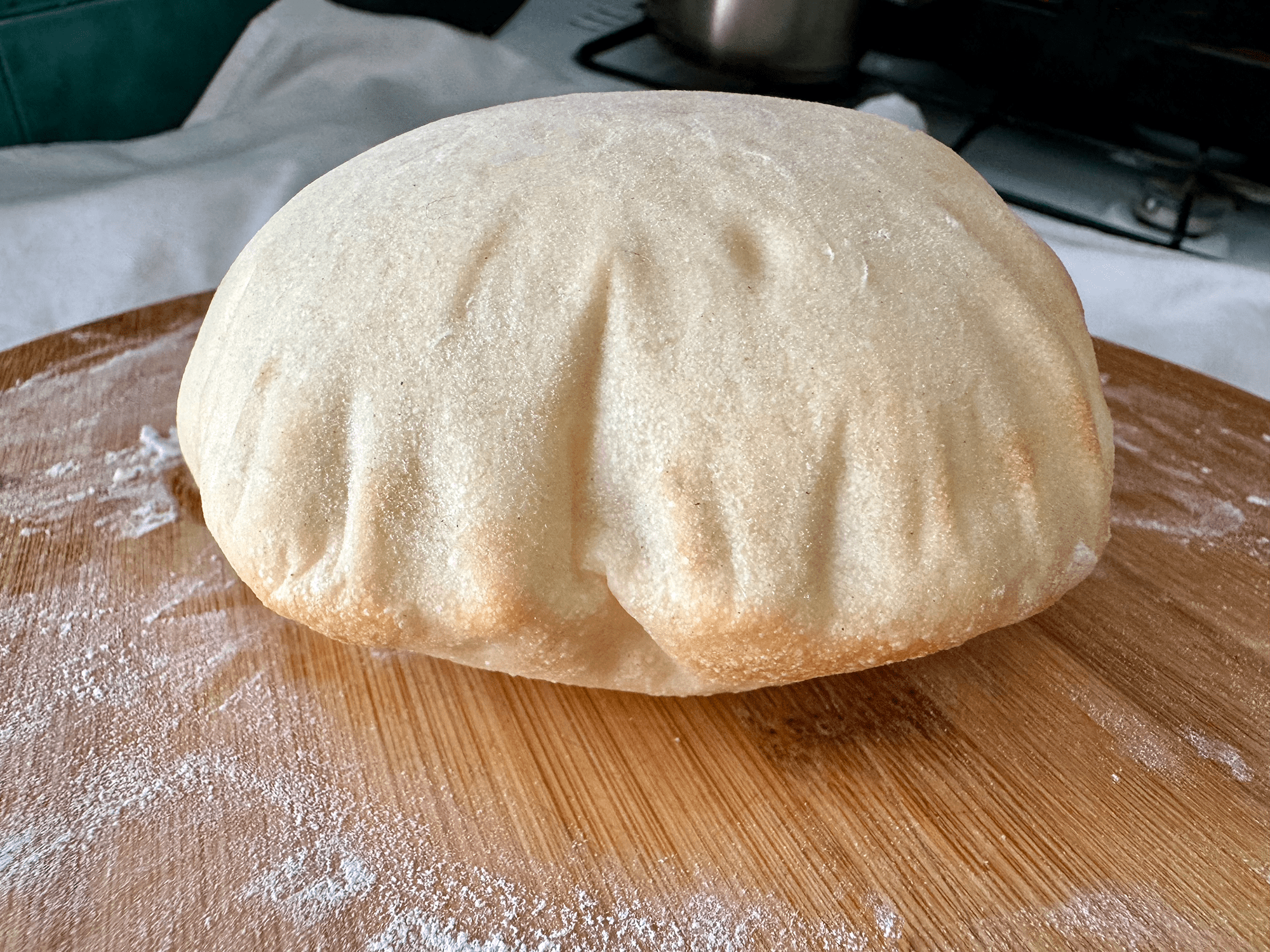 Викладіть «млинці» на дощечку, застелену пергаментом. Накрийте і залиште на 15 хвилин. Тим часом добре розігрійте духовку до 250 °C, режим «верх-низ». Важливо розігрівати піч на максимум, разом з перевернутим деком, на якому пектиметься хліб. Піта надувається лише тоді, коли температура дуже висока.