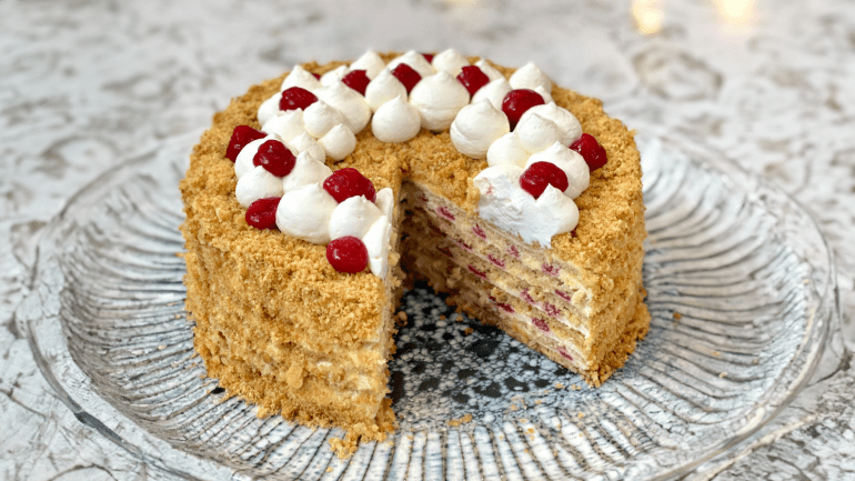 Команда SHUBA була направду вражена красою медівника від Лізи Глінської. Вам також сподобається цей легкий, ніжний десерт, складений із запашних тоненьких медових коржів, змащений заварним кремом і малиновим мармеладом.