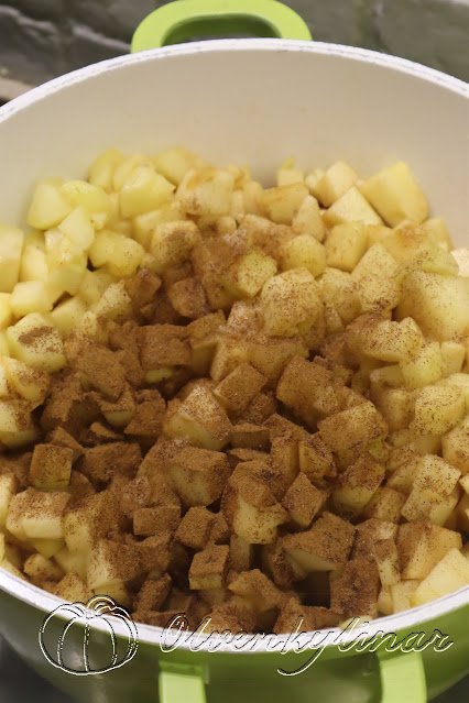 Розтопіть на пательні масло, висипте туди яблука, додайте яблука, добре вимішайте. Потушкуйте декілька хвилин, щоб яблука пустили сік, додайте ванільний екстракт (або ванільний цукор), мелену корицю і палички кориці, ретельно вимішайте. Тушкуйте на середньому вогні до 15 хвилин або поки не випарується вся рідина, відтак вийміть палички кориці.