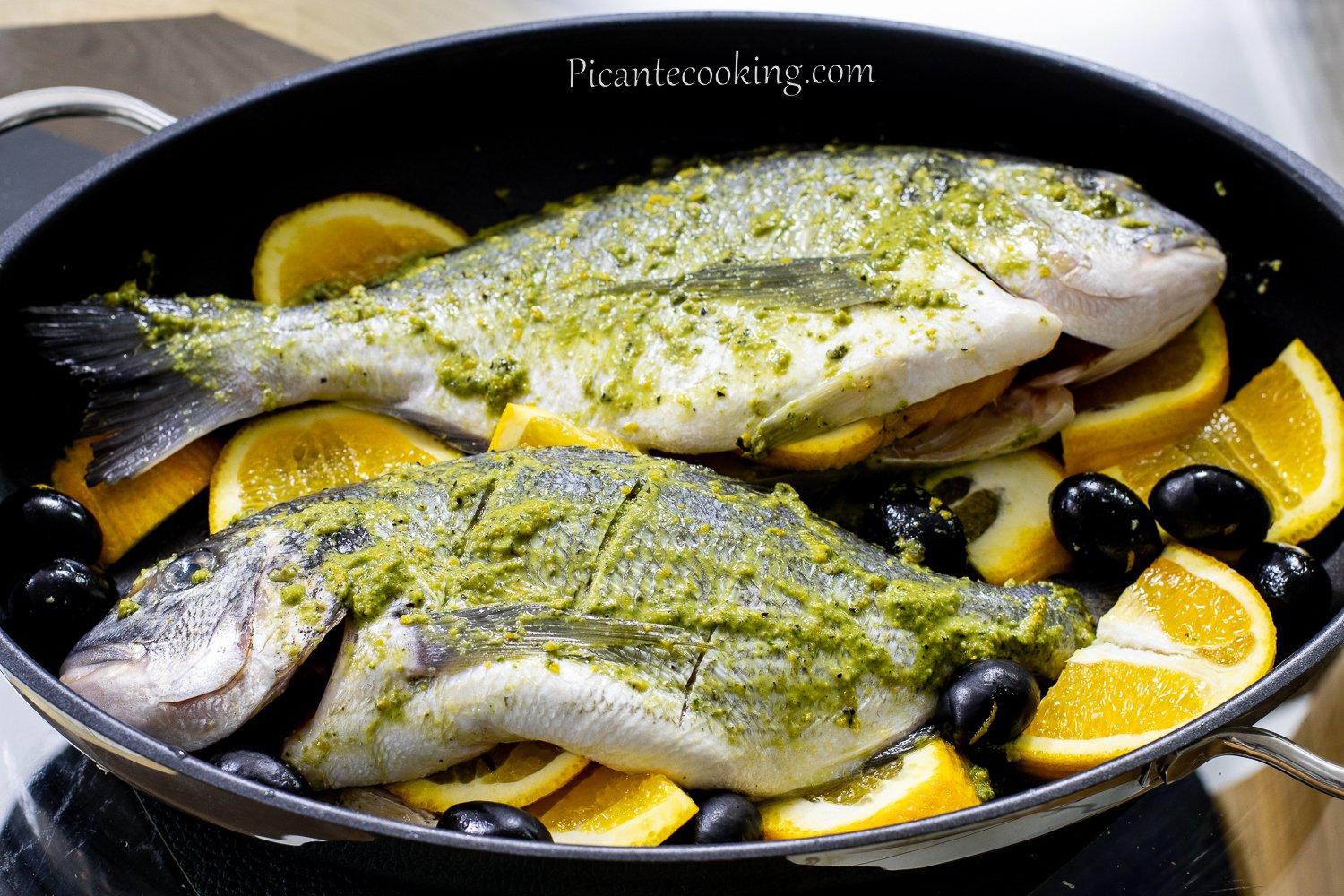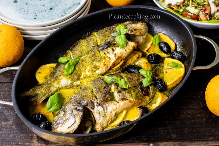 Соковита і дуже ароматна дорадо з цитрусовими здивує, як і її поєднання із запеченими кружечками кисло-солодких апельсинів та оливок. Ви приготуєте все доволі швидко, маючи час на інші справи. А якщо є бажання поекспериментувати, замість доради можна використати річкову форель чи сибаса, а замість базиліку, — петрушку. Теж буде смачно і цікаво!