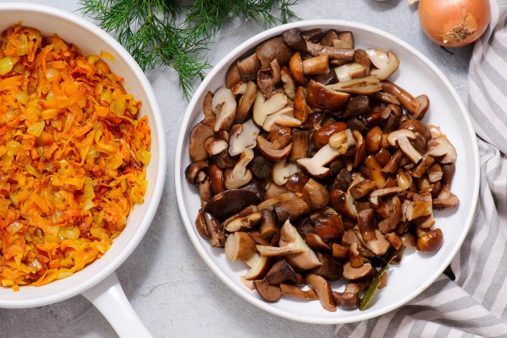 Використовуйте сушені (100 г) або заморожені (400 г) лісові гриби — ті, які маєте. Також можна взяти свіжі печериці чи гливи (300 г).